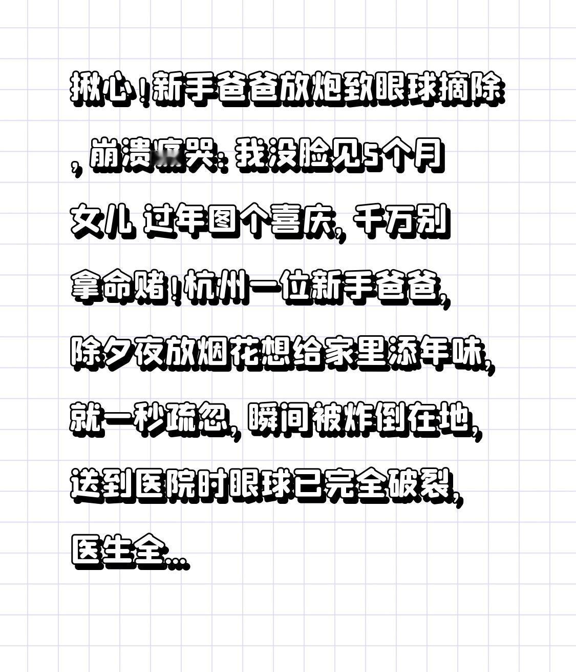 揪心!新手爸爸放炮致眼球摘除,崩溃痛哭:我没脸见5个月女儿 过年图个喜庆,千万别拿命赌!杭州一位新手爸爸,除夕夜放烟花想给家里添年味,就一秒疏忽,瞬间被炸倒在地,送到医院时眼球已完全破裂,医生全力抢救5小时,最终还是不得不摘除眼球。 病床上,这个顶天立地的男人哭得撕心裂肺,反复念叨一句话:女儿才5个月,我刚学会当爸爸,以后怎么面对她? 他不怕疼、不怕残疾,怕的是再也看不清女儿的笑脸,怕女儿长大后害怕他的样子,怕没能守护好小家,愧疚到窒息。 本以为只是个人疏忽的悲剧,越往后越让人头皮发麻。事发当晚,这家医院眼科一夜接诊12名烟花炸伤患者,4台急诊手术从除夕忙到初一,有人角膜炸穿、有人眼睑毁容,每年春节都有类似惨剧,可总有人觉得“倒霉的不会是我”。 很多人放炮时图省事:不看说明书、凑近点引线、捡哑炮、在人群旁燃放,甚至抱着孩子放。烟花爆炸冲击力极强,一旦击中眼睛,几乎是毁灭性损伤,轻则视力永久受损,重则直接摘除眼球,一辈子都活在遗憾里。 这位爸爸原本幸福圆满,刚迎来小生命,对未来满是期待,一场意外,把全家的年过得支离破碎。他不是不爱孩子,不是不小心,只是心存了一丝侥幸,就付出了终生代价。 过年的快乐,不该建立在危险之上。别等意外发生才后悔,别让团圆变成伤痛。为了父母、为了孩子、为了身边最爱的人,遵守禁放规定,远离非法烟花,燃放时做好防护,宁可少点热闹,也要守住全家平安。 你身边有放炮受伤的例子吗?今年会安全燃放吗?评论区提醒更多人!