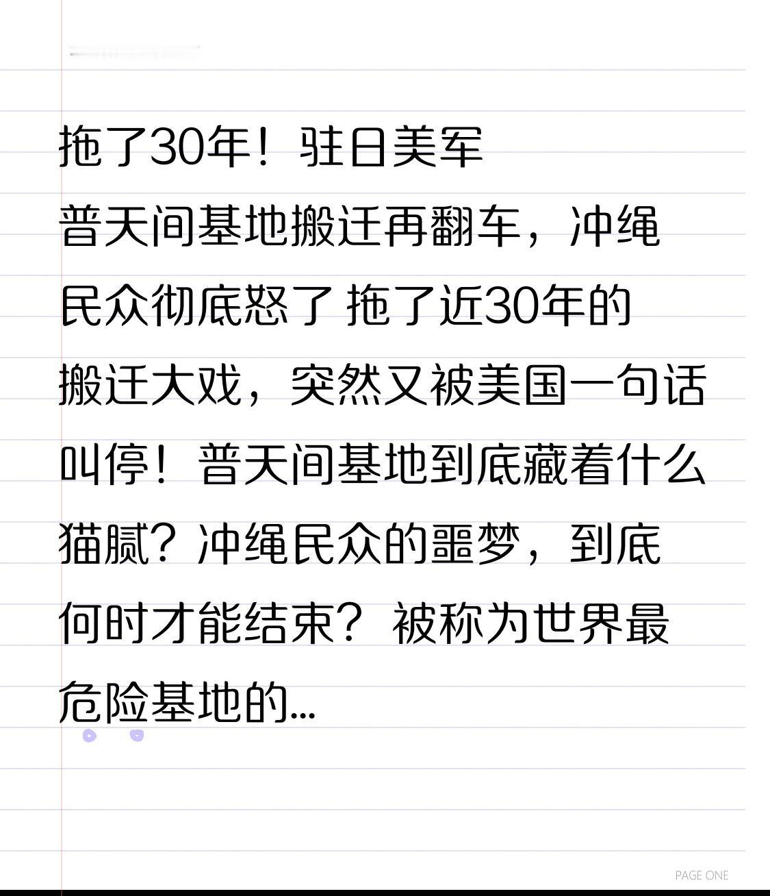 拖了30年!驻日美军普天间基地搬迁再翻车,冲绳民众彻底怒了 拖了近30年的搬迁大戏,突然又被美国一句话叫停!普天间基地到底藏着什么猫腻?冲绳民众的噩梦,到底何时才能结束? 被称为世界最危险基地的普天间,就扎在冲绳宜野湾市中心,四周全是居民区、小学和医院。军机日夜轰鸣、事故频发,2004年直升机直接坠毁冲绳国际大学,民众常年活在恐惧里。冲绳仅占日本国土0.6%,却扛着70%的驻日美军基地,这份不公,忍了几十年。 1996年日美说好:搬去边野古、归还普天间,日本砸巨资填海施工,民众以为终于能盼来安宁。谁料工程一拖再拖,边野古遭全民反对,噪音、污染、安全隐患,没解决反而添新乱。日本中央强推、地方死扛,最高法院判冲绳败诉,民众游行不断,这场拉扯早已耗尽耐心。 就在大家以为熬到头时,剧情彻底反转!2026年2月,美国国防部直接摊牌:没合格长跑道,绝不归还普天间!原来边野古跑道只有1800米,远不够F-35等军机满载起降,美方一句“任务能力缺陷”,把日本几十年投入打了水漂,还把选址锅甩给日本政府。 一边是冲绳民众绝望怒吼:不想再当“战场殖民地”;一边是日本中央有苦难言,花大钱、得罪人,最后被盟友摆一道;美军则稳坐钓鱼台,继续占着黄金地段,安全、便利全占,代价全由普通人承担。 这哪里是基地搬迁,分明是大国博弈下,小人物的血泪悲歌。主权尊严、民生安宁,在利益面前如此脆弱。冲绳的今天,也给世界提了醒:依附换不来真正安全,牺牲民众利益的协议,终究站不住脚。 这场闹剧还没落幕,冲绳民众的抗争仍在继续。你觉得日本该妥协还是硬刚?美军该不该信守承诺?评论区说说你的看法!