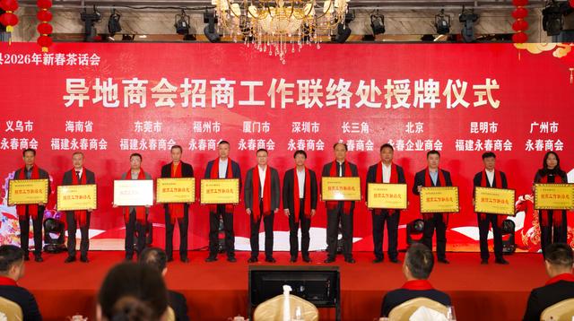 活动中,县委书记吕建成、县长张照绿共同为广州、昆明、北京、长三角、深圳、厦门、福州、东莞、海南、义乌等首批10个异地商会招商工作联络处颁牌,各联络处将成为永春对外招商的“前沿窗口”、项目对接的“服务驿站”,为家乡发展牵线搭桥、添砖加瓦。