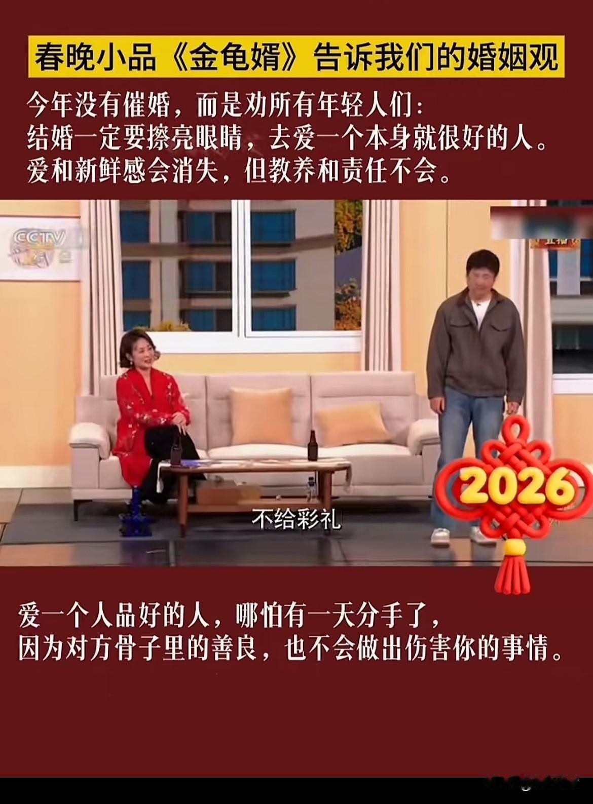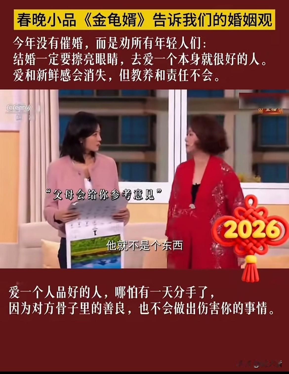 央视今年春晚小品没催婚,而是输出了超正的爱情观。结婚得擦亮眼睛,去爱本身就好的人。爱和新鲜感易逝,可教养和责任不会。真正决定婚姻幸福的,是对方的人品善良、对婚姻的忠诚,还有原生家庭刻在骨子里的三观和教养。不能为了结果就结婚生子,人生路长,得等那个真正惺惺相惜的人。就像有人相遇让你相信人间值得,有人却教你人间清醒。找个三观正、人品好的人,即便爱没了,他的教养也不会让他伤害你。婚姻是大事,慎重选择才能收获幸福。