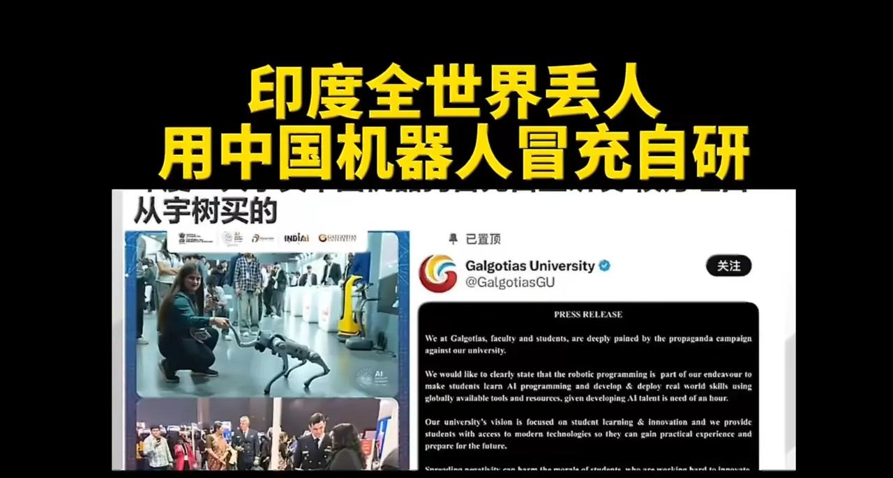 日前的“印度AI影响峰会”,本来印度是想在全世界露一次大脸,没想到成了被狠狠打脸。 最大的丑闻就是印度高戈蒂亚斯大学(Galgotias University)将买来的中国宇树科技(Unitree)公司生产的商用机器狗Go2冒充为自己的创新成果。 在造假被揭穿之后,作为峰会主办方的印度电子与信息技术部不得不要求高戈蒂亚斯大学撤展并离开现场。而之前不少为印度“科技成就”感到自豪的印度官员和网民也默默删了自己的帖。 然而,高戈蒂亚斯大学虽然正式道歉,但仍然在不断为自己的造假行为狡辩,丝毫没有吸取教训、痛改前非的意思,而是懊悔自己造假太糙,被现场抓包。 让人惊讶的是,造假的不只是高戈蒂亚斯大学,后续曝光的还有印度IT巨头Wipro、安永印度分公司同样用宇树机器狗贴牌参展。 高戈蒂亚斯大学展出的所谓“自研无人机”,只是一个用泡沫塑料拼接的手工模型,连印度记者都看不下去,认为“四年级学生的作品都被这精致”。在一片批评声中,主办方最终切断展位电源,并强行将该校参展团队驱逐出去。 除此之外,本届印度AI影响峰会还有其他很多遭到吐槽的问题,其中吐槽最多的组织混乱。场馆WiFi瘫痪,支付系统仅收现金,导致国际参会者无法购买餐饮;注册系统反复崩溃,部分提前报名者被拒入场,闭门会议因人流失控临时关闭;莫迪突临引发强制清场,导致参展商被锁在馆外,部分样品遗失;新德里酒店价格暴涨15倍(套房每晚3.3万美元),交通管制致参会者步行数公里离场。 而在峰会合影环节中,OpenAI CEO奥特曼与Anthropic CEO阿莫代伊拒绝莫迪的牵手提议,默契举拳回避接触,被网民调侃为“AI冷战”。 可以说,印度AI影响峰会,暴露出印度一大堆问题,而且还引发了印度社会的撕裂,印度不少印度南方邦的民众批评“北部骗补”。 有意思的是,印度AI影响峰会上印度高校和企业多起造假都涉及中国宇树公司的产品,反而给宇树的全球影响力打了一波免费广告。