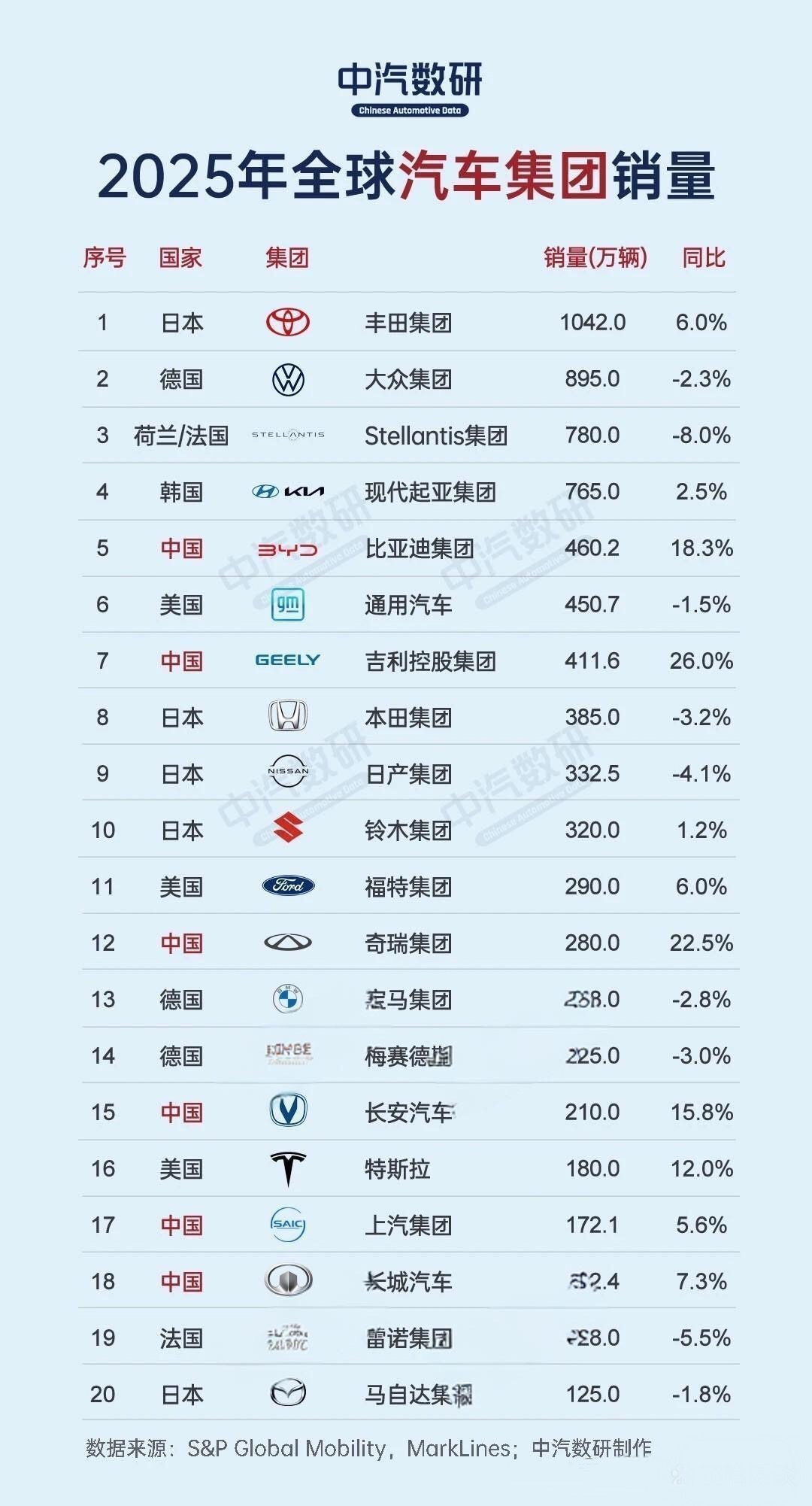 排名:比亚迪全球第五,吉利第七。 丰田1132万辆,大众898万辆,现代起亚727万辆,占据世界销售盘踞前三。 比亚迪2025年卖了460万辆,纯电动车首次超越特斯拉,登顶全球第一。吉利411万辆,新能源渗透率冲到56%,同比暴增58%。 增速:比亚迪同比增长18.3%,吉利26%,奇瑞22.5%,长安15.8%,长城7.3%,上汽5.6%。另一边呢?大众跌0.5%,Stellantis掉8%,通用降1.5%,本田下滑3.2%,日产跌4.4%。除了特斯拉靠着12%的增速硬撑,欧美日韩主流车企几乎全是负增长。