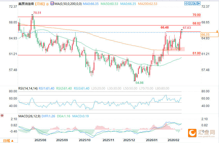 WTI原油测试1月29日高点后未能站稳,当前报66.30美元附近,未形成有效突破(需1小时级别K线收盘站稳高点),凸显短期多空博弈激烈。目前油价显著高于200日均线(战争风险溢价关键指标),短期内预计维持在该均线上方(±0.50美元)。