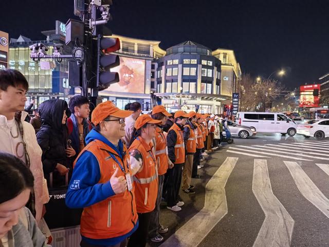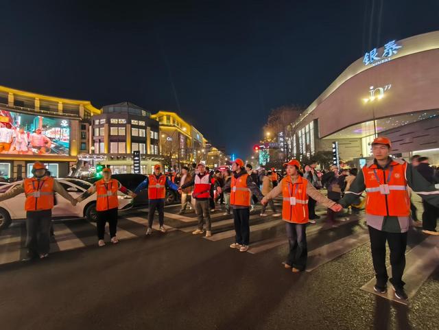 2月20日,正月初四。傍晚18时,杭州延安路与平海路交叉口准时出现了一抹熟悉的身影——40余位身着橙色马甲的志愿者在车水马龙间穿梭。他们手拉着手,随红绿灯的明暗交替,像一道流动的“分割线”,时而舒展、时而收拢,在熙熙攘攘的人潮与有序通行的车流之间,筑起一道温热的屏障。