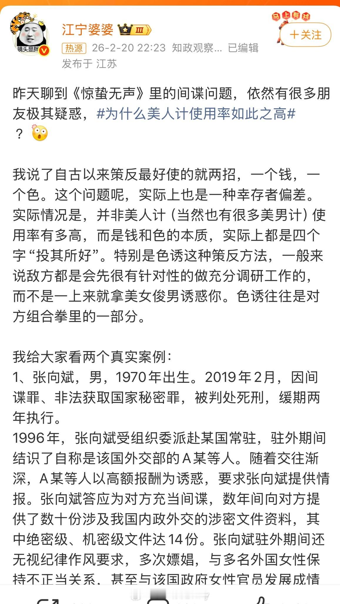 为什么美人计使用率如此之高涨姿势了!江宁婆婆也看了我们惊蛰无声!影视作品来源于生活并高于生死,惊蛰无声的选材,整体剧情真的凝炼扎实,艺谋的含金量