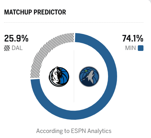 ESPN预测明日比赛:森林狼胜率74.1%,独行侠胜率25.9%