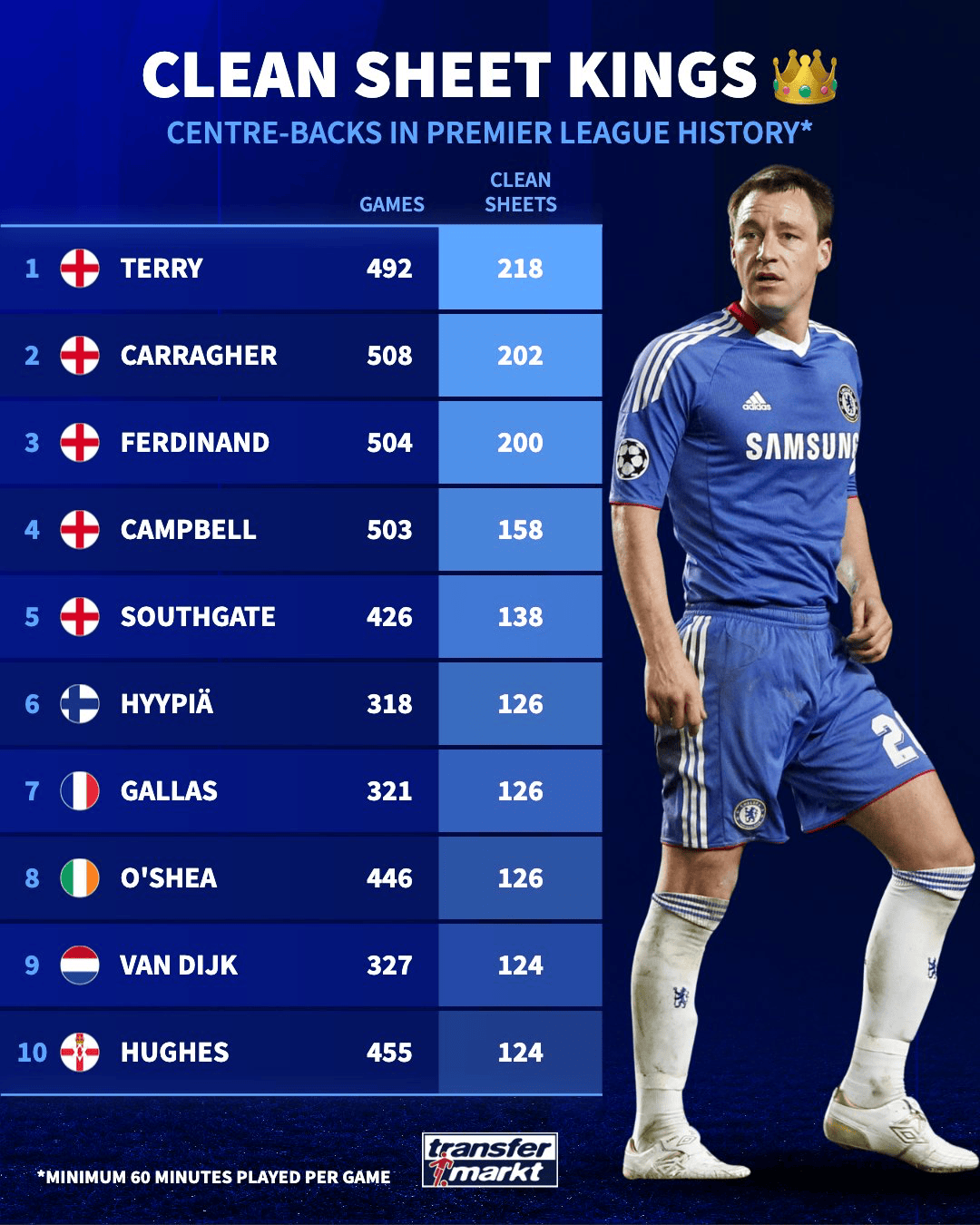 虎扑02月20日讯德国转会市场统计了英超历史上完成过最多次零封的中卫球员,详情如下: