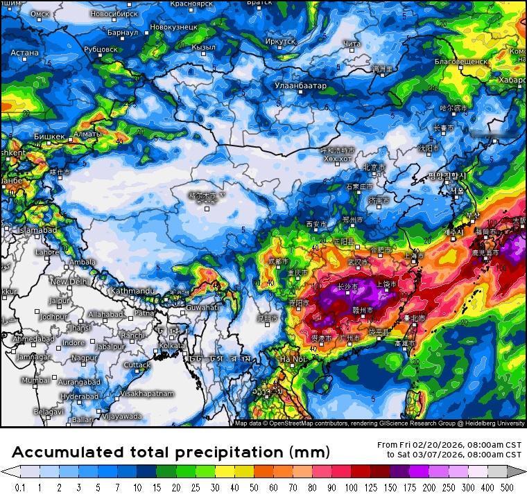 可以确定的是,未来一段时间,南方的降水会非常的多,累计降水量也很大,部分地区不排