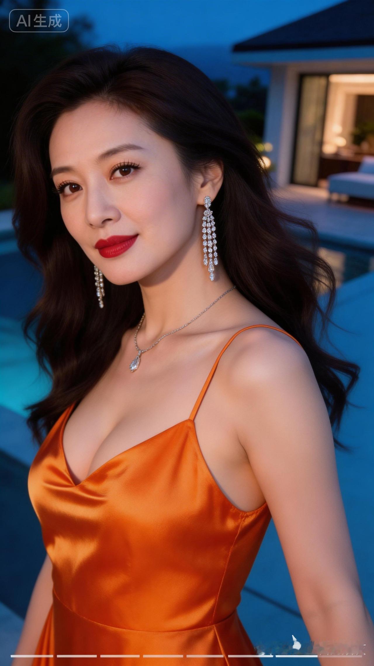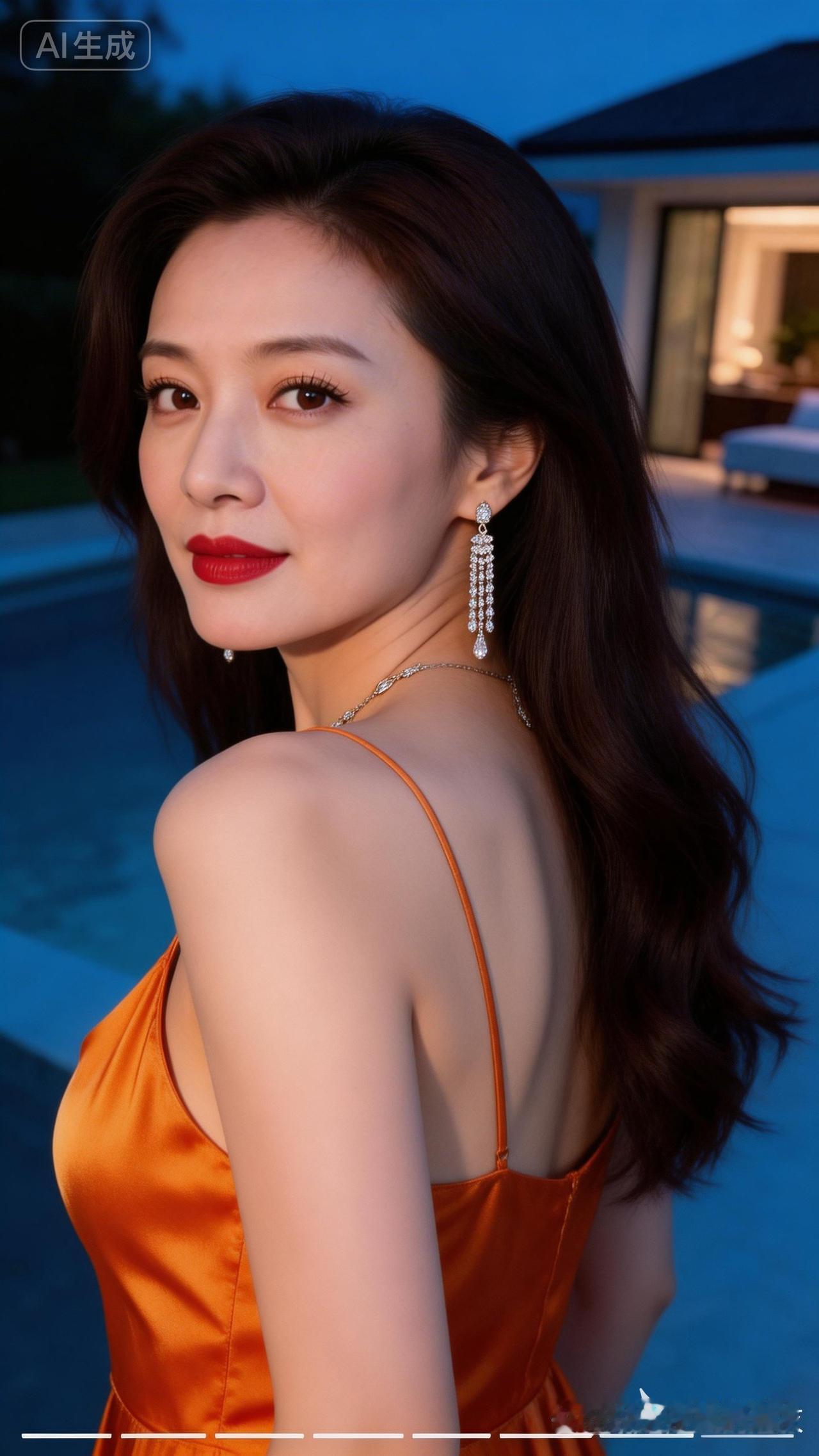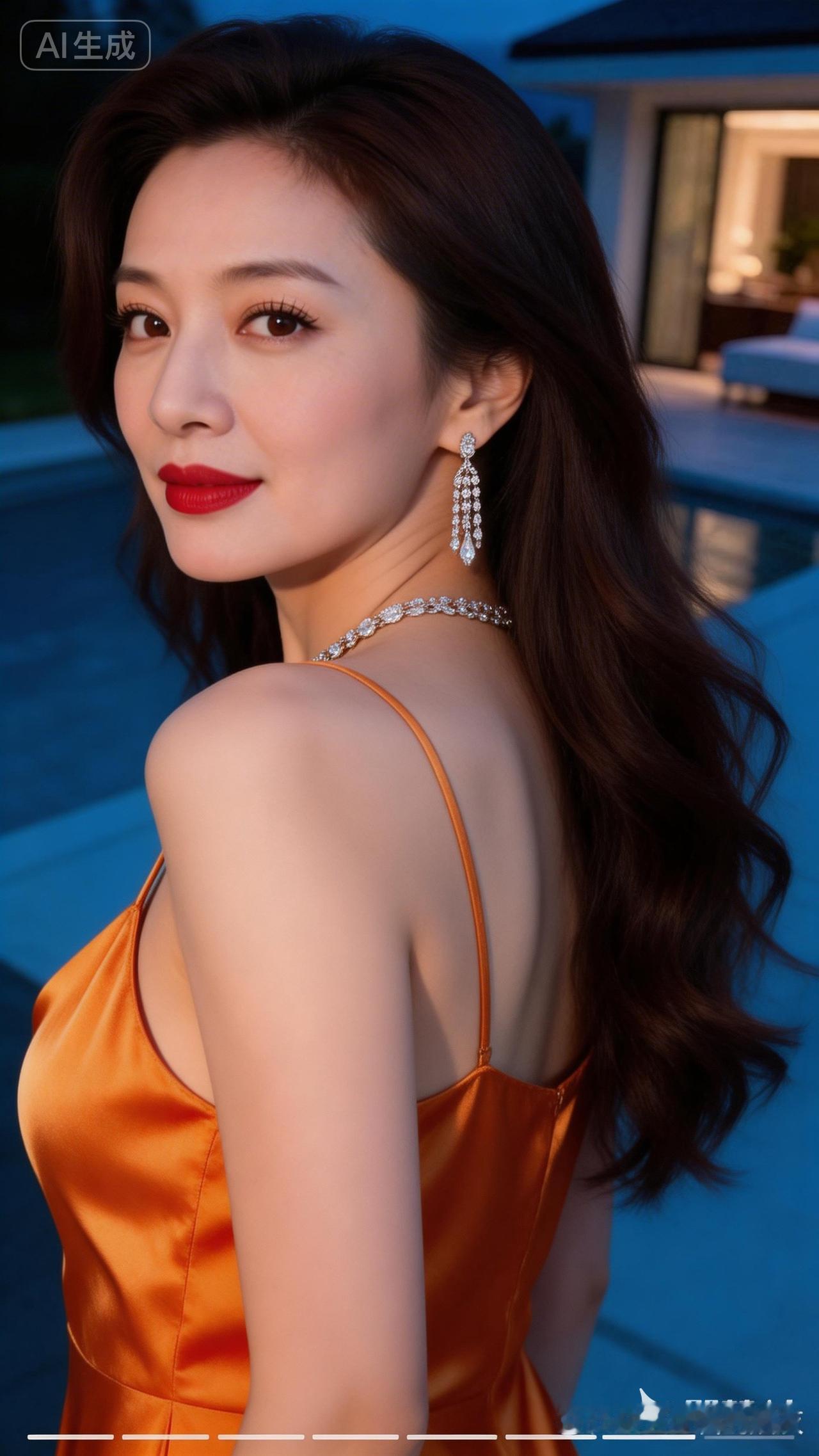 优雅红唇,闪耀耳环,橙裙晚宴,尽显迷人魅力!