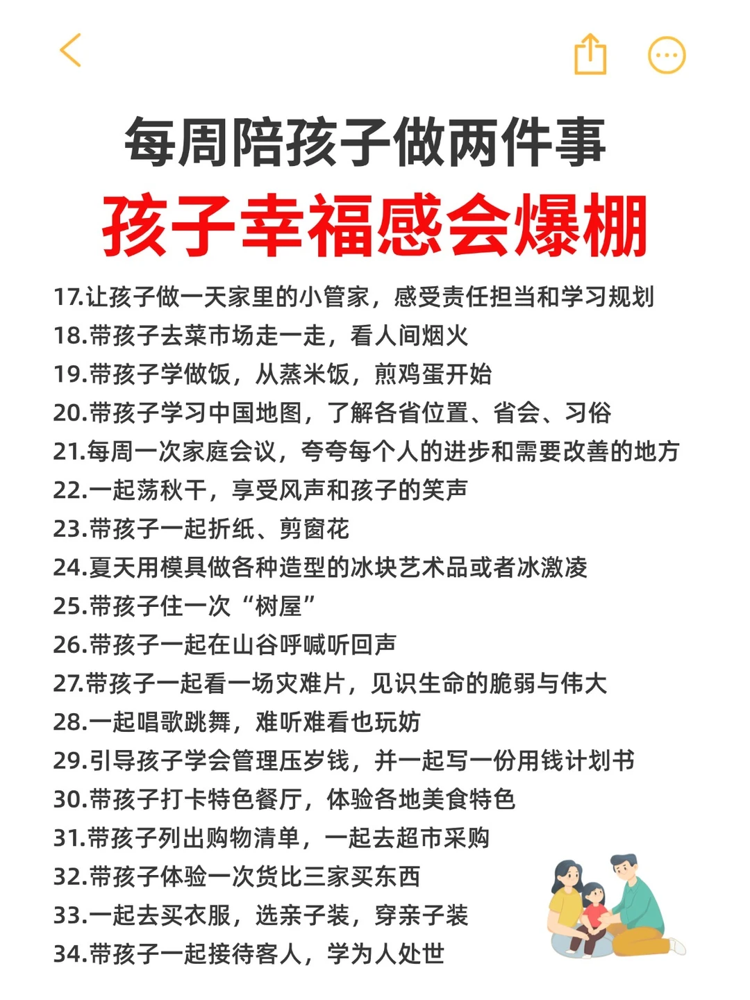 当妈5年了,真心觉得陪孩子不在于去多贵的地方,而在于有没有“看见”他。 以前我也焦虑,周末必须排满去各种亲子乐园,结果大人累得半死,孩子回来啥也不记得。 后来我开始摆烂,试着带他在小区楼下疯跑、甚至就一起在厨房霍霍面粉,反而发现他眼睛里是有光的。 我整理了这份 【陪孩子做的50件幸福小事清单】 ,都是不花钱或者花小钱的日常。每周哪怕只做2件,你会发现亲子关系真的会变“黏糊”!