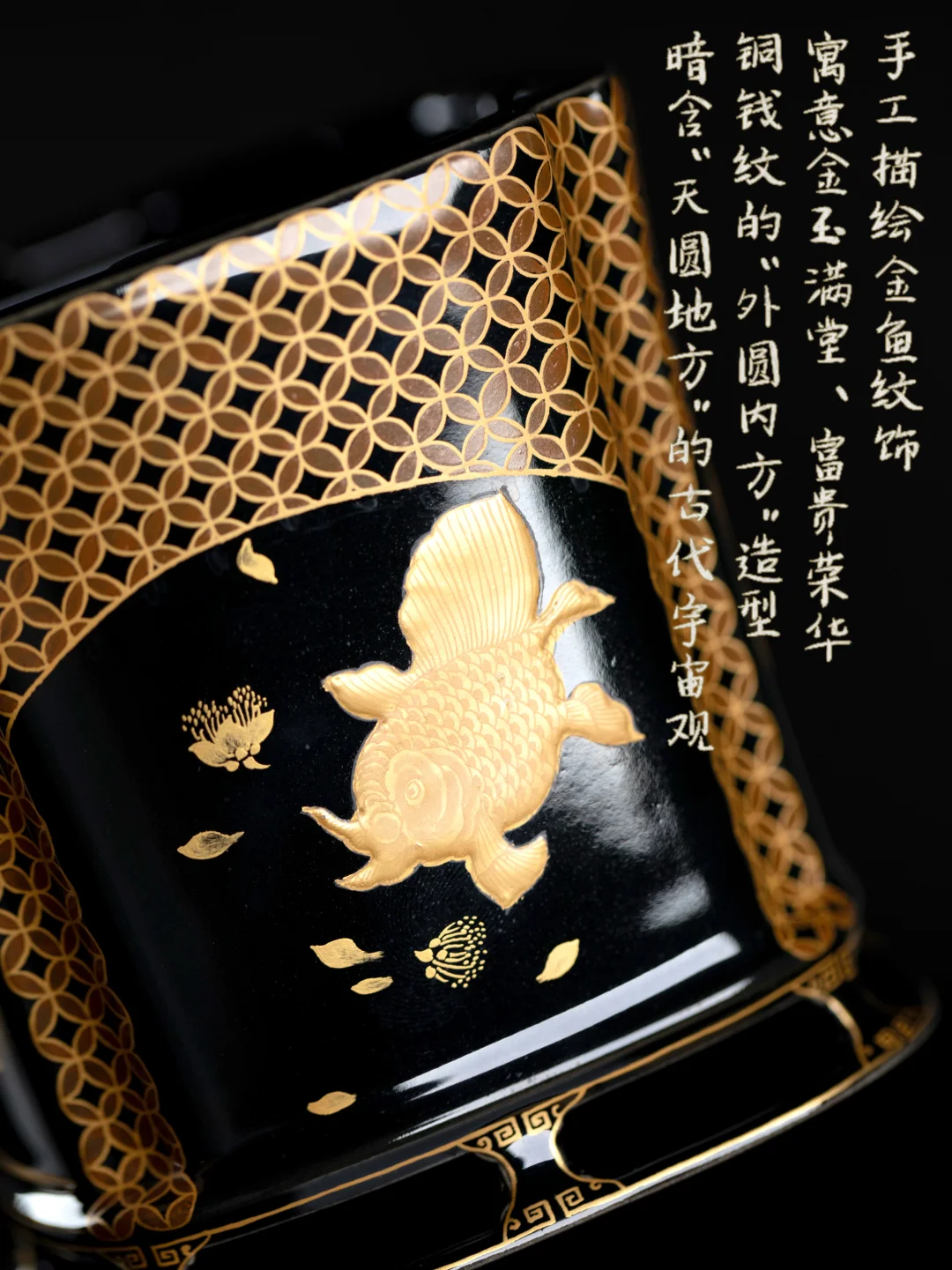 一器两用,是冬日里的贴心设计。炉上可煎香,让香气慢慢释放;亦可暖一壶茶,让茶汤始终温热。深邃的黑釉衬着金鱼纹,流光间,满是暖意。