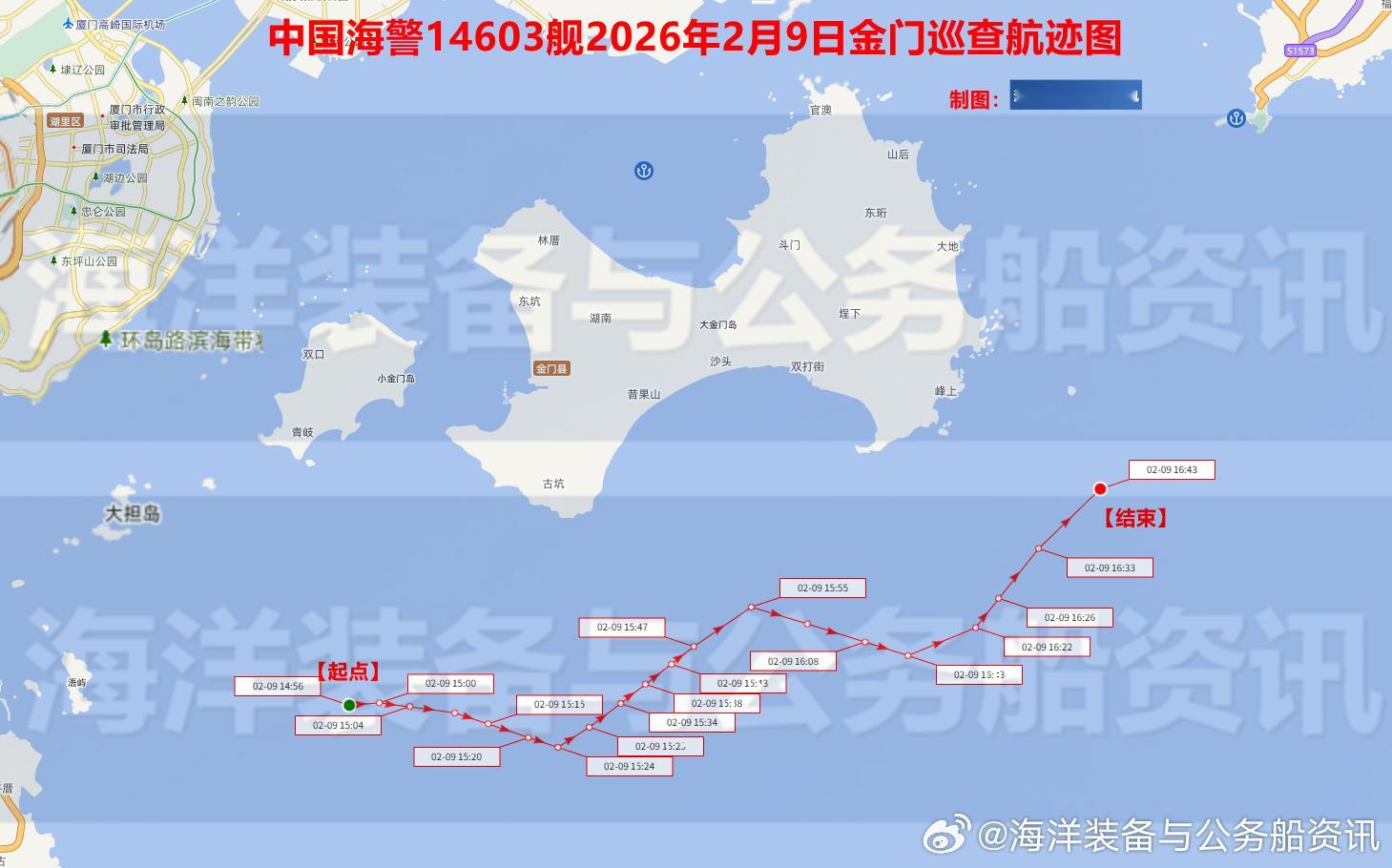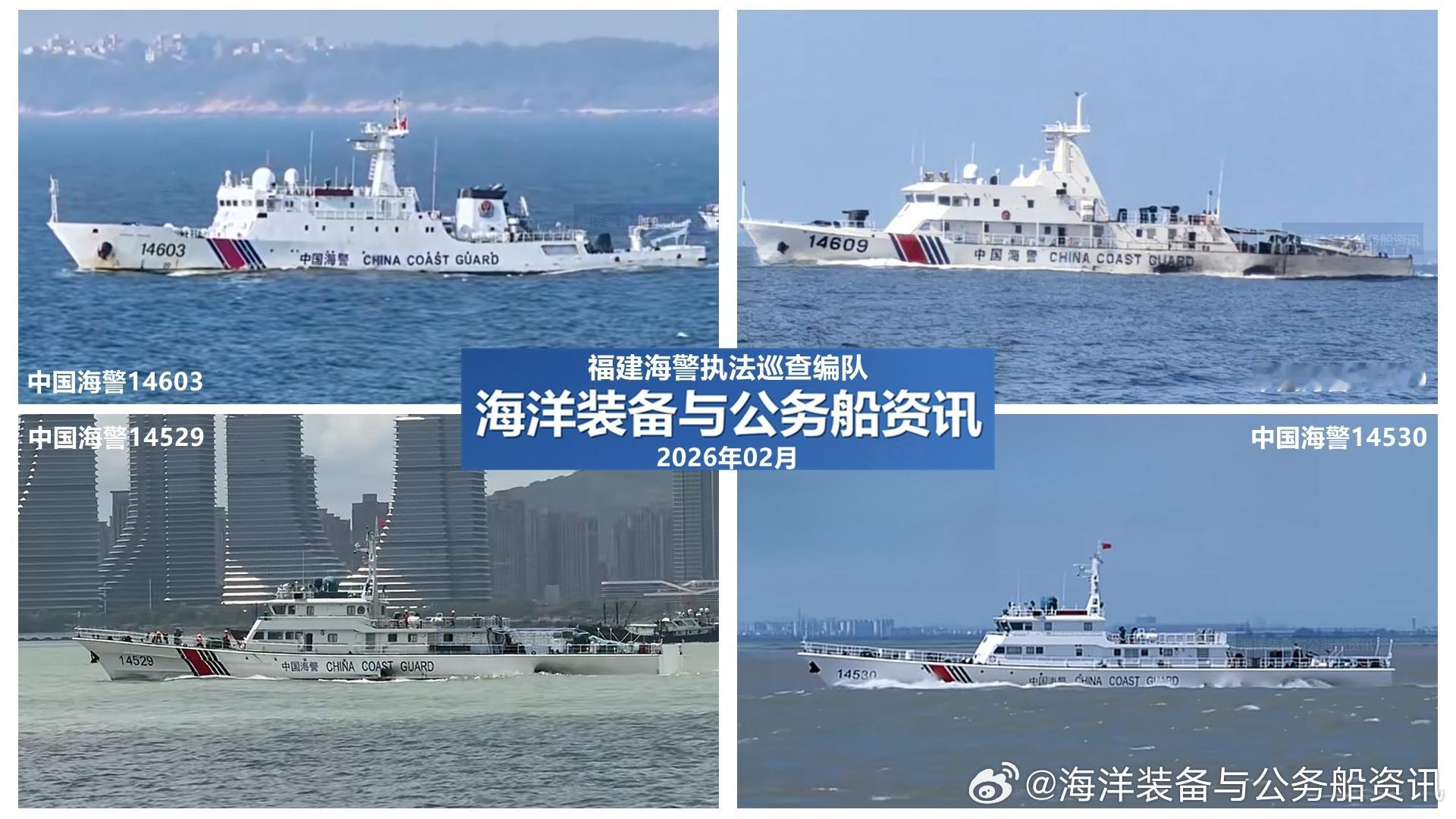 福建海警位金门附近海域开展常态执法巡查 【海警】2026年2月9日、10日下午15:00-17:00,2月13日上午9:00-11:00,福建海警局所属由中国海警14603舰、中国海警14609舰、中国海警14529艇和中国海警14530艇组成的舰艇编队位我福建省金门岛南侧海域开展常态化执法巡查(2026年第5、6、7次)。中国海警在行动中国海警执法 【详情点击】网页链接