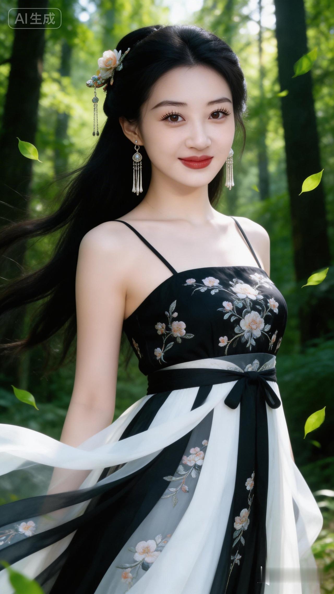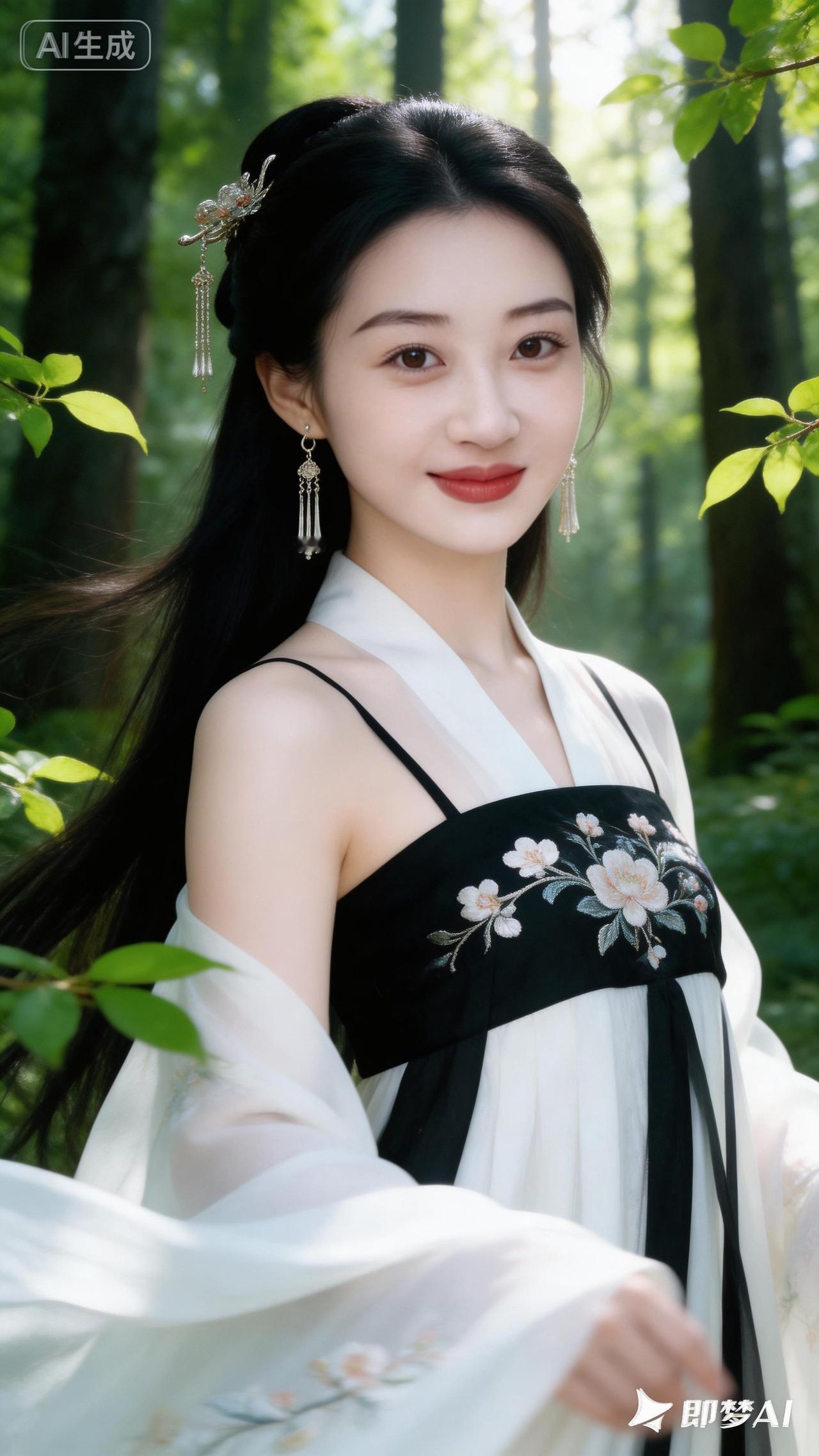 森林中的仙子,黑发红唇,白纱飘逸,宛如画中人。