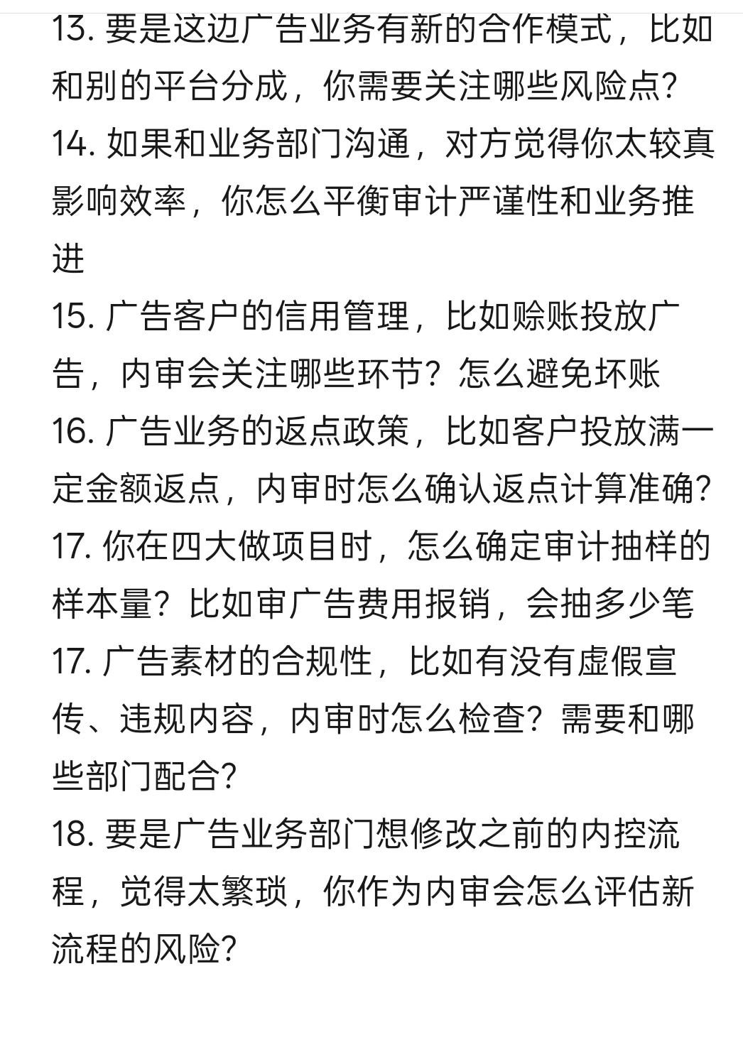 13. 要是这边广告业务有新的合作模式,比如和别的平台分成,你需要关注哪些风险点?