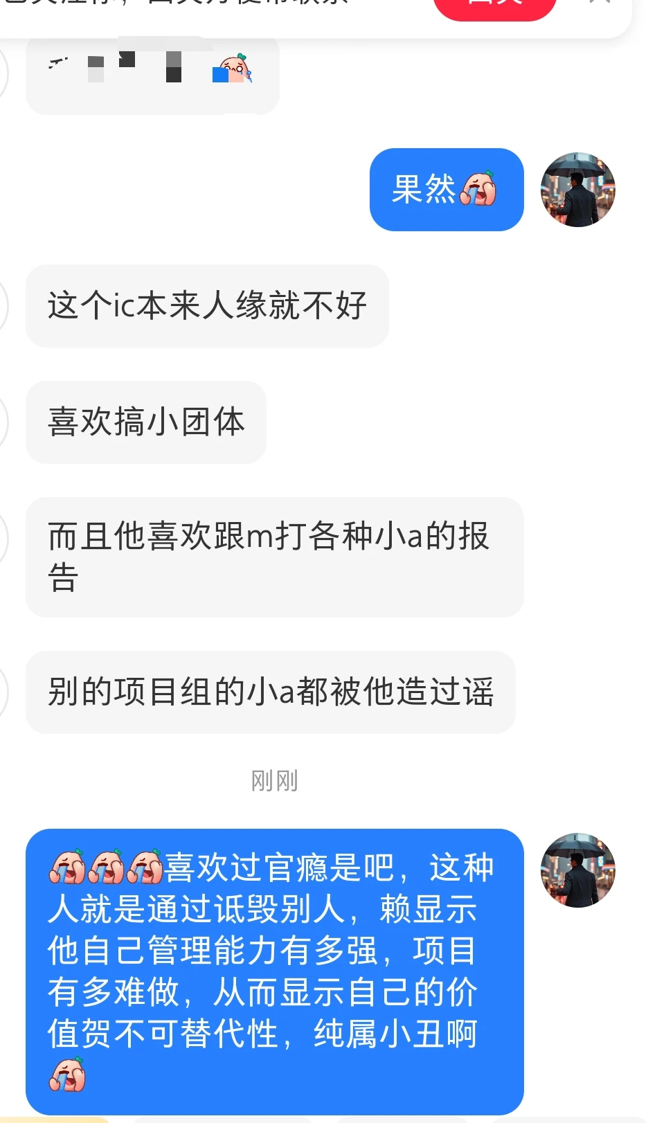 我个人理解就是: [捂脸R][捂脸R][捂脸R]喜欢过官瘾是吧,这种人就是通过诋毁别人,赖显示他自己管理能力有多强,项目有多难做,从而显示自己的价值贺不可替代性,纯属小丑啊[捂脸R] 另外给大家给这位同学一些方向吧,遇到这种开局真的运气不好。