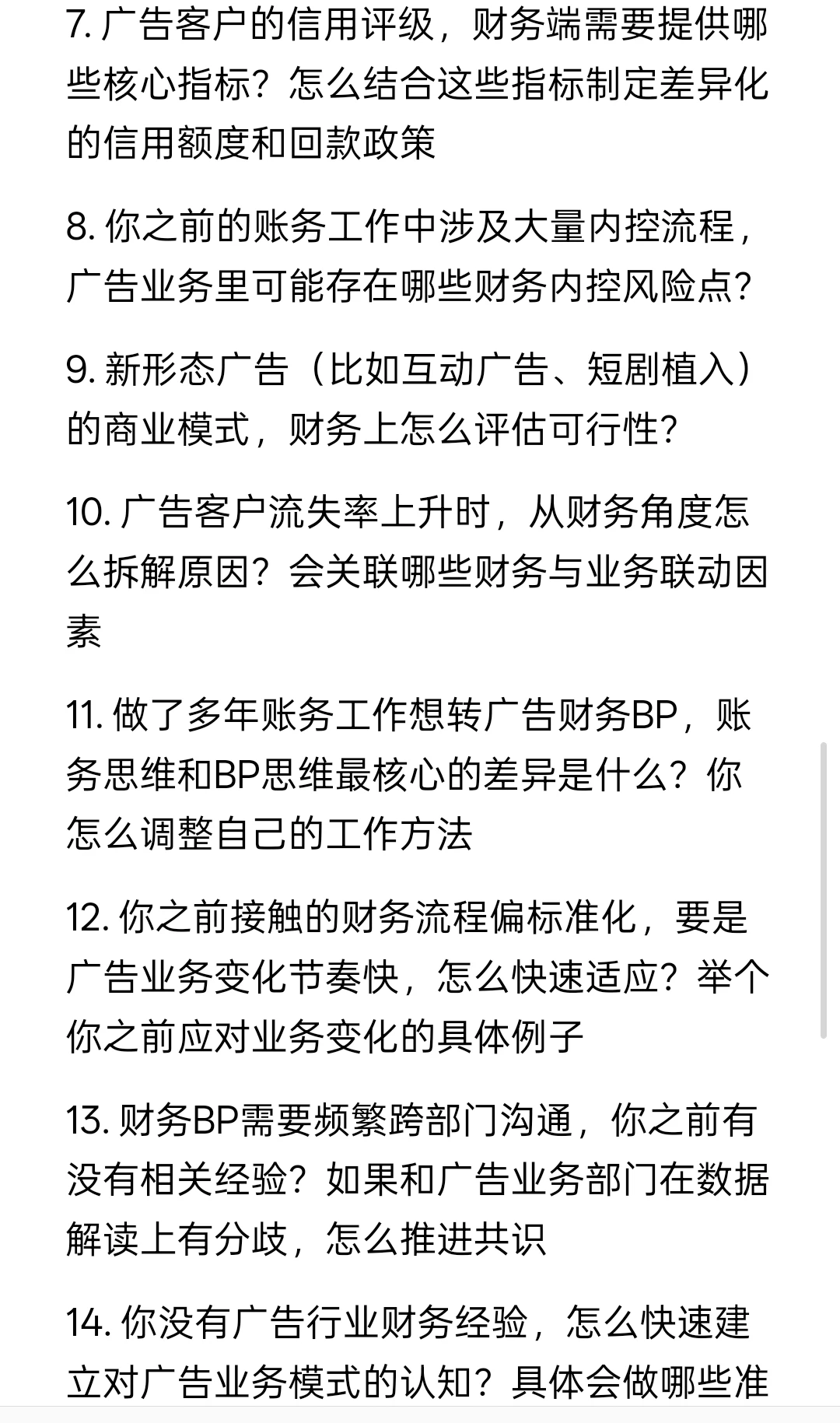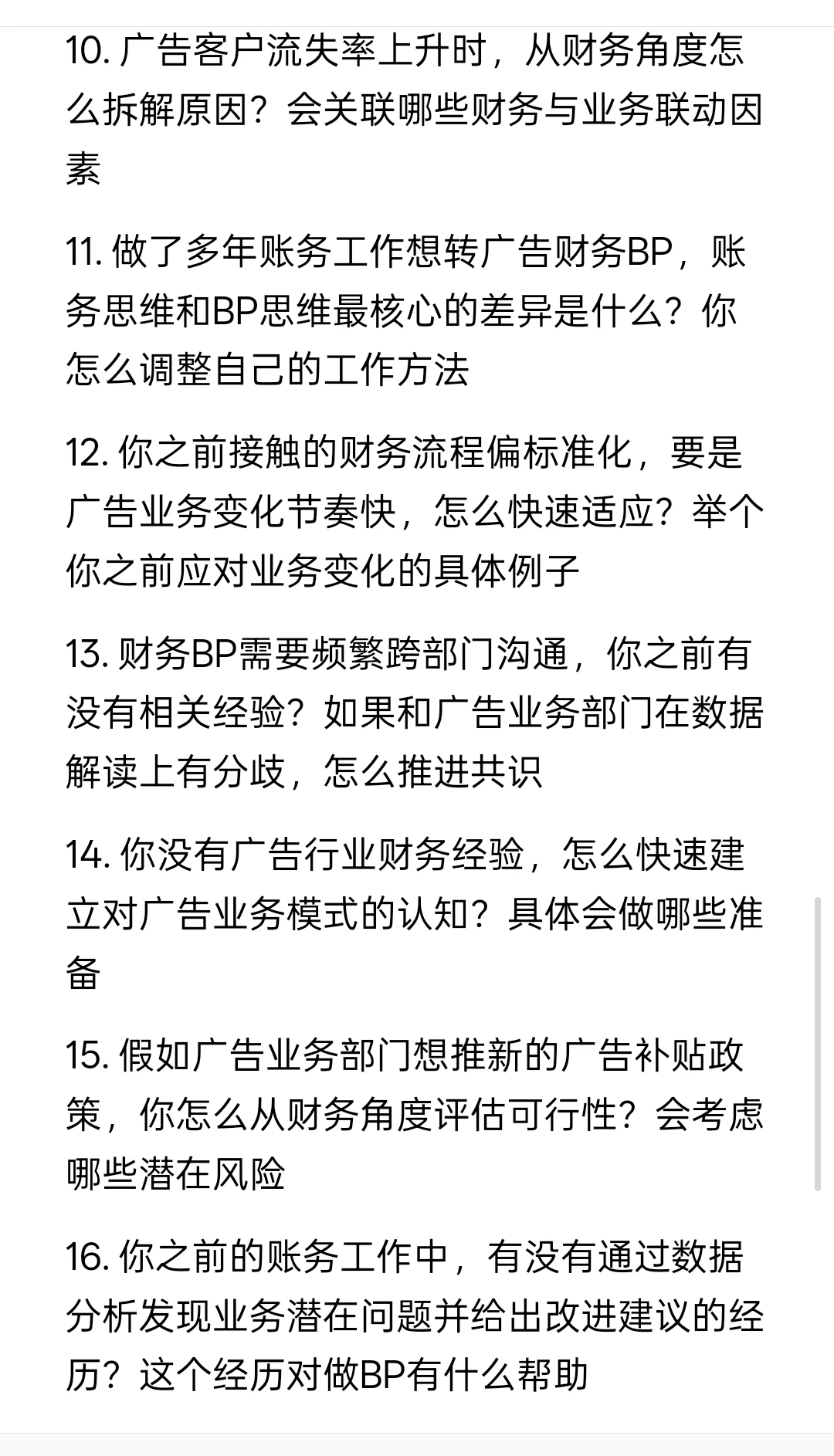 11. 做了多年账务工作想转广告财务BP,账务思维和BP思维最核心的差异是什么?你怎么调整自己的工作方法