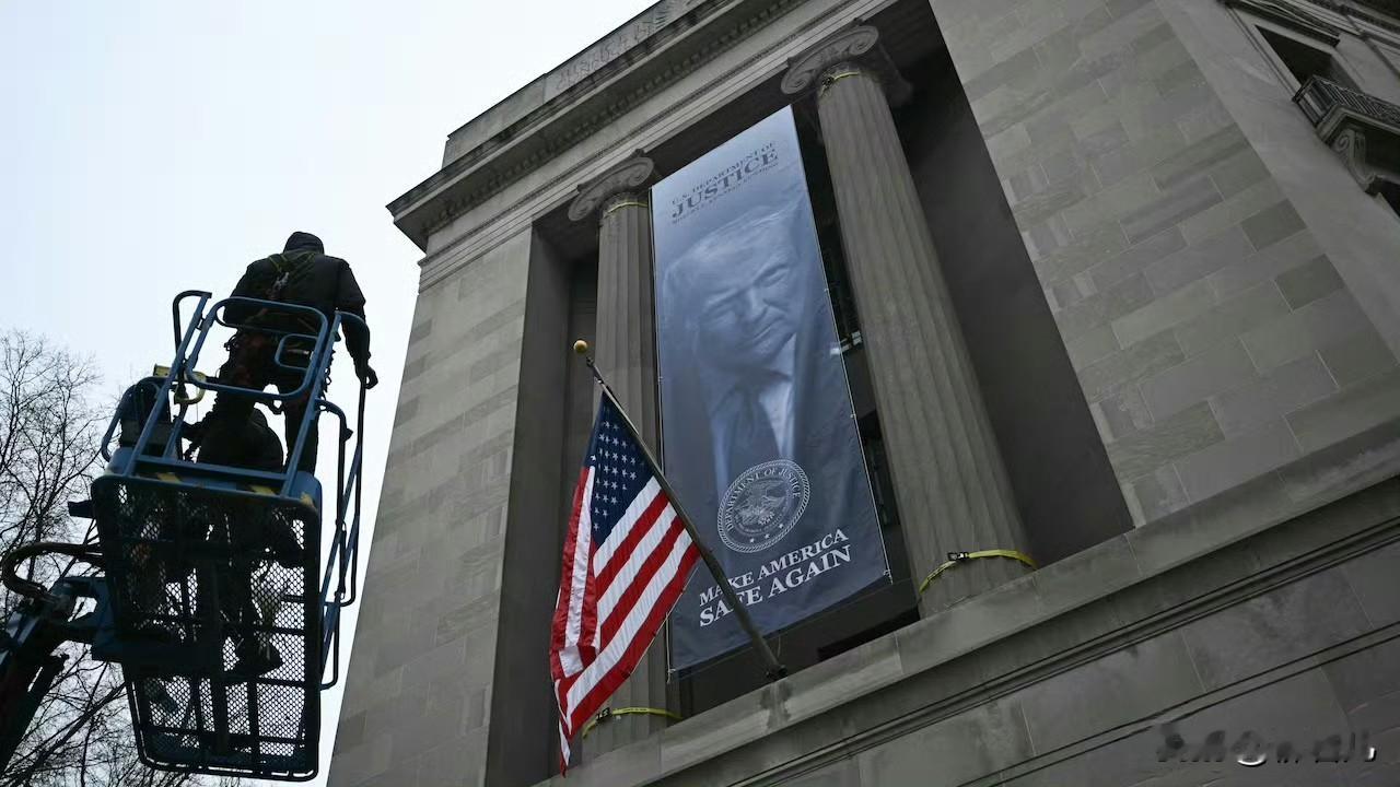 美国司法部大楼外赫然悬挂特朗普巨幅肖像,并写着「让美国再次安全」,这一举动迅速引爆舆论。美司法部历来强调独立于白宫的政治干预,而此番高调展示个人化政治标语,被广泛解读为行政权力对司法传统界限的模糊化试探。