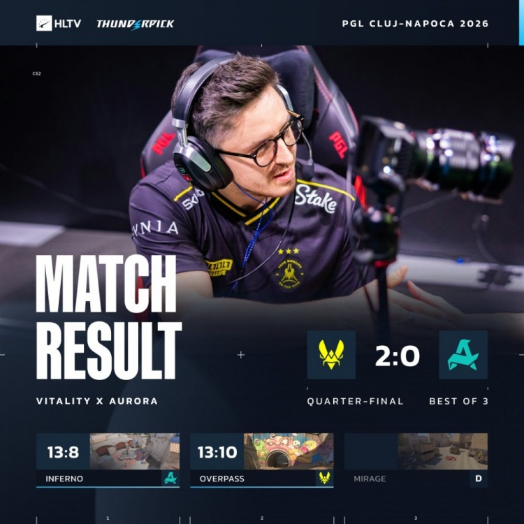 随后礼神爆轰四杀+狠人特三杀,长枪局礼神左手双人四杀,Aurora连追4分,比分来到8-11。第20回合,小蜜蜂枪械不全,狠人与soulfly开场工地被杀,Aurora难赢3v5残局送小蜜蜂赛点,随后Aurora连追3个赛点被锁10分,Zywoo大狙双杀收尾,小蜜蜂以13-10拿下图二横扫淘汰Aurora,晋级四强!