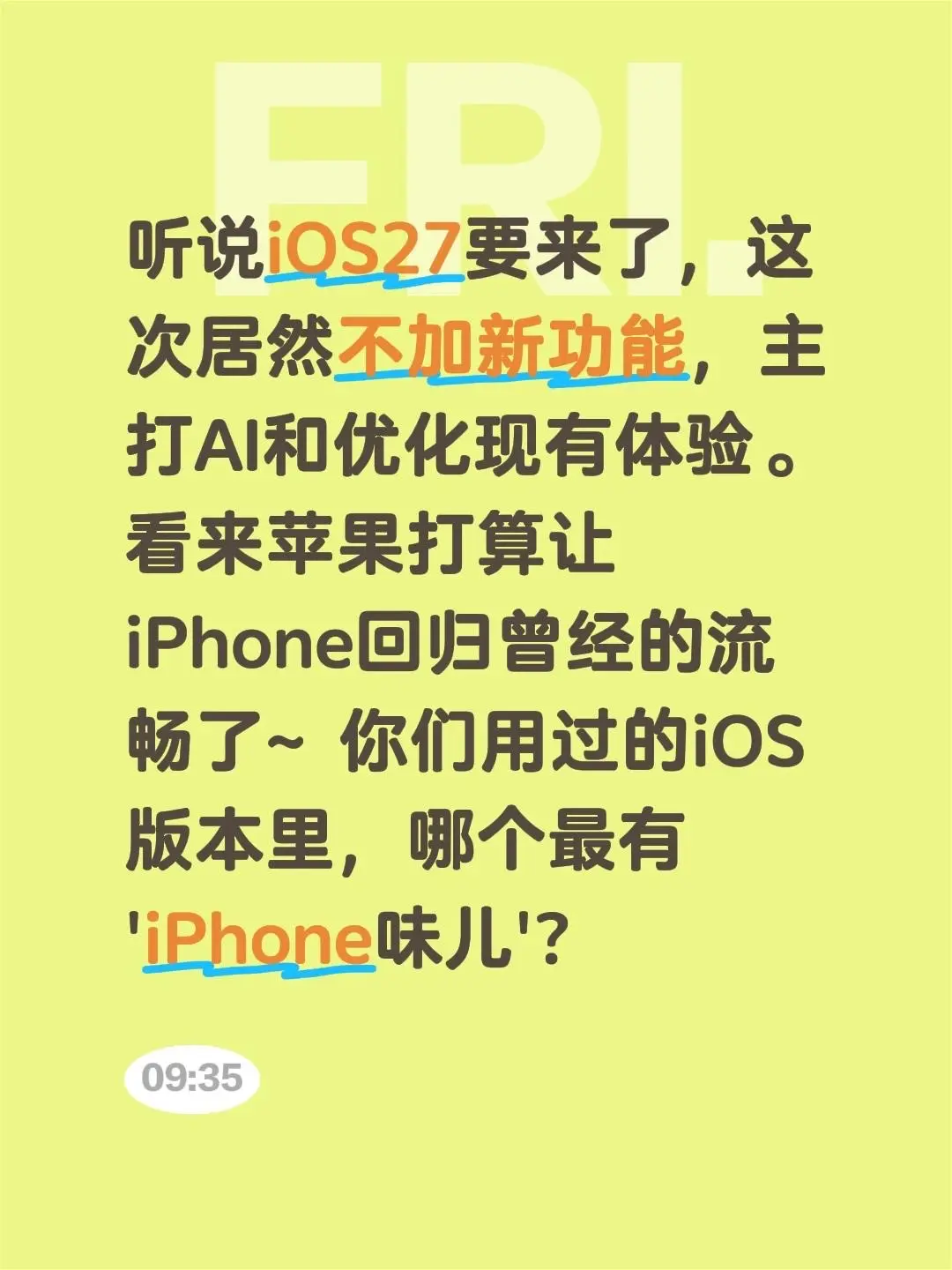 据说ios27以优化为主,要回归流畅了。听说iOS27要来了,这次居然不加新功能,主打AI和优化现有体验。看来苹果打算让iPhone回归曾经的流畅了~ 你们用过的iOS版本里,哪个最有'iPhone味儿'?