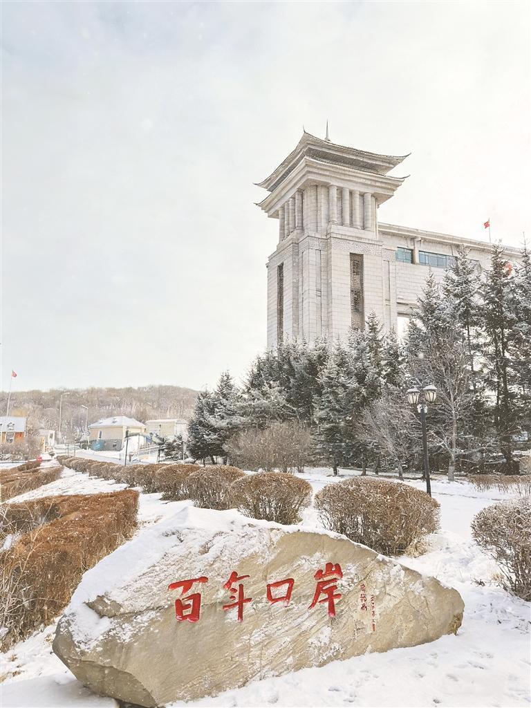 距市中心三公里处,坐落在中俄国境线上,集三代国门建筑于一体的边境景区,四季风光尽显其华。春夏秋之致,我早已熟稔于心。唯独这落雪的冬季,我还是第一次踏进国门。远望二代国门,素雪覆身,清灰底色更显沉静。它形似火箭发射架,四座塔尖直击天空,左右两侧直角三角形呈镜像之势,中间横亘一道厚重横梁。走近,时而能听到雪落下的窸窣声,正上方横梁上“绥芬河口岸”五个朱红大字赫然醒目,托举起一枚正中闪亮的国徽。从二代国门抬眼右望,第三代国门已然入眸,四角飞檐凌云而起,漫入流云。