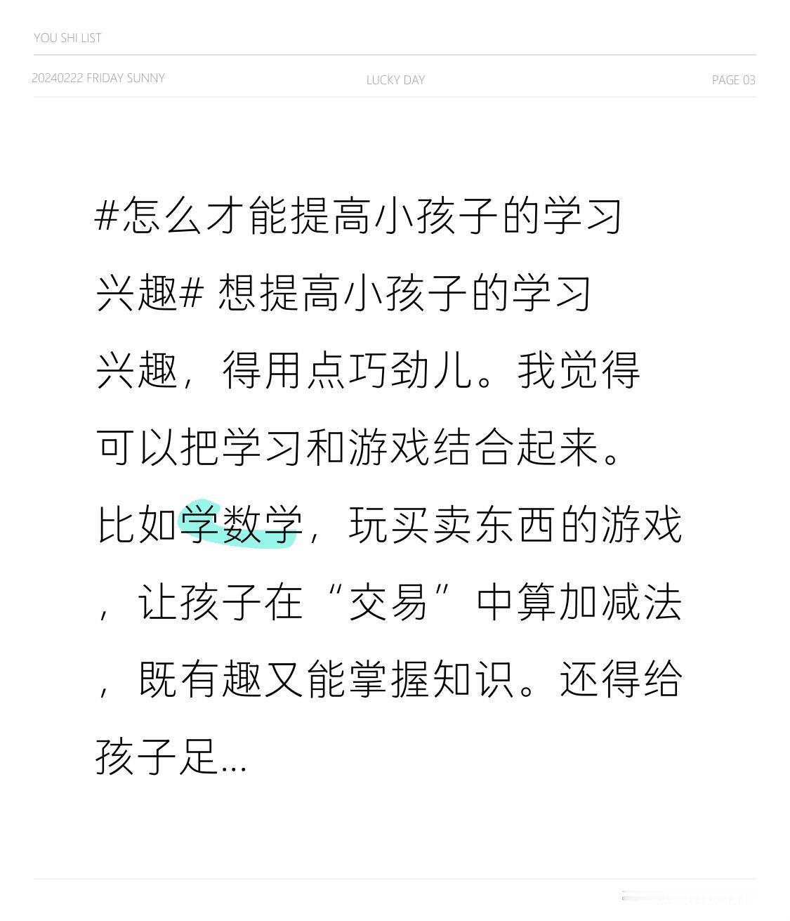 想提高小孩子的学习兴趣,得用点巧劲儿。我觉得可以把学习和游戏结合起来。比如学数学,玩买卖东西的游戏,让孩子在“交易”中算加减法,既有趣又能掌握知识。 还得给孩子足够的自主空间。别总是盯着他们,让孩子自己安排学习时间和内容,这样他们会更有掌控感。就像我邻居家孩子,以前学习很被动,后来家长放手让他自己规划,学习积极性明显提高了。另外,多鼓励孩子也很重要,每一次小进步都值得表扬,让他们从学习中获得成就感,兴趣自然就来了。