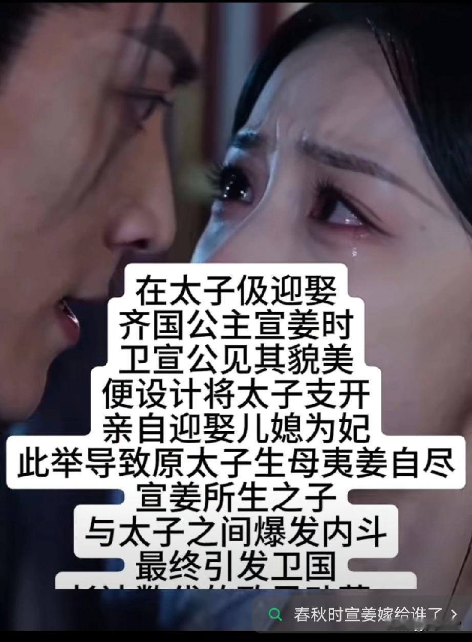 皇室太乱 在太子伋迎娶齐国公主宣姜时, 卫宣公见其貌美,便设计将太子支开,亲自迎娶儿媳为妃。 此举导致原太子生母夷姜自尽,宣姜所生之子与太子之间爆发内斗,最终引发卫国长达数代的政局动荡。