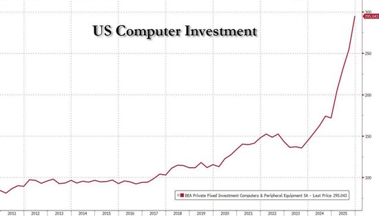 值得关注的是人工智能推动的电脑及外设支出持续爆发。过去一年此类支出增长70%,到2025年底已超过3000亿美元,较2022年ChatGPT推出以来翻了一倍以上。媒体称,预计这一趋势将在今年进一步提振经济,目前美国四大科技公司已预计将在2026年合计投入约6500亿美元,用于数据中心及相关设备建设。