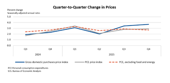 此外,国内总购买价格指数在第四季度上涨3.7%,第三季度上涨3.4%。个人消费支出(PCE)价格指数上涨2.9%,第三季度上涨2.8%。剔除食品和能源后的PCE价格指数上涨2.7%,第三季度上涨2.9%。