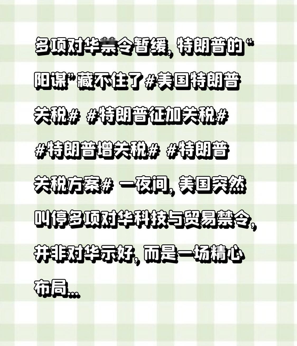 多项对华禁令暂缓,特朗普的“阳谋”藏不住了 美国特朗普关税 特朗普征加关税 特朗普增关税 特朗普关税方案 一夜间,美国突然叫停多项对华科技与贸易禁令,并非对华示好,而是一场精心布局的阳谋。表面释放缓和信号,实则为特朗普4月访华铺路,同时缓解国内产业困境。 过去美方极限打压,导致本土5G、数据中心、电动车产业链严重受阻,企业与消费者苦不堪言。中国产业链性价比与不可替代性,让“脱钩”难以为继。美方此举是务实求利,并非放弃遏制战略。 美国内部分歧显现,所谓“安全风险”多为政治借口。中方回应坚定理性,欢迎合作但保持清醒。暂停禁令只是战术调整,美方遏制底色未变。 这轮博弈提醒我们,外部松动不可轻信,核心技术必须自主可控。唯有做强自身、稳住产业链,才能在中美博弈中掌握主动,破解一切算计。特朗普加增关税 特朗普贸易大棋 特朗普美国关税