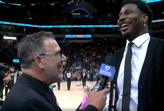 比赛的第二节,小贾伦以爵士球员身份重返灰熊主场,在场边接受采访。