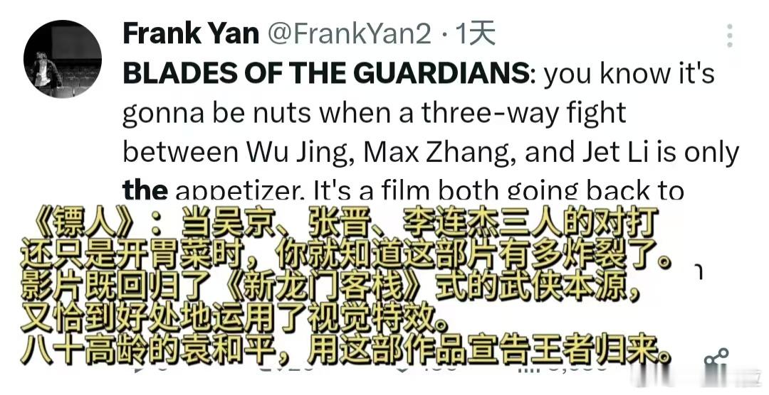 镖人海外评价镖人海外口碑 “在好莱坞看不到这样的武侠,粗粝、悲壮、又充满诗意。”