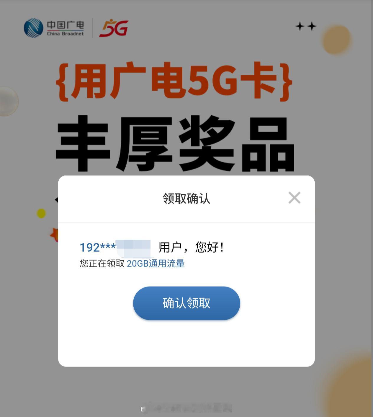 广电有送大通用流量包了——下载广东广电谷豆 TV,注册后就可以直接领取 20G 通用流量。虽然是广东广电的 App 但不限卡号归属地,哪个地区的广电卡都可以领取……