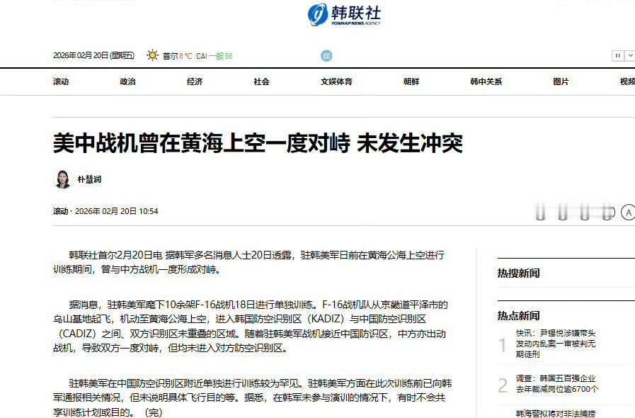 附:【2026年2月的中美战机对峙事件】2026年2月18日(农历大年初二),驻韩美军麾下10余架F-16战机从京畿道平泽市的乌山基地起飞,成建制在黄海公海上空进行单独训练,机动至韩国防空识别区与中国防空识别区之间未重叠的区域。随着美军战机接近中国防空识别区,中方出动战机,导致双方一度对峙,但均未进入对方防空识别区。