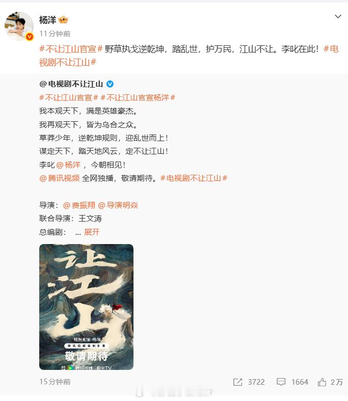 杨洋官宣不让江山杨洋官宣了不让江山杨洋正式加盟《不让江山》,官宣饰演从草莽少年成长为乱世帝王的李叱,剧集于2月21日释出概念海报,开机在即,粉丝热情应援。