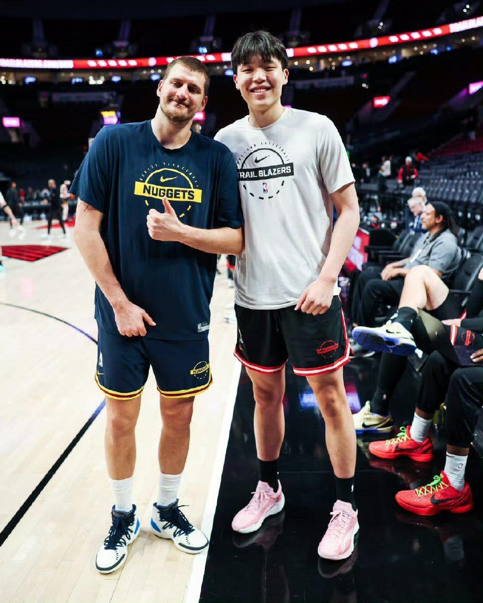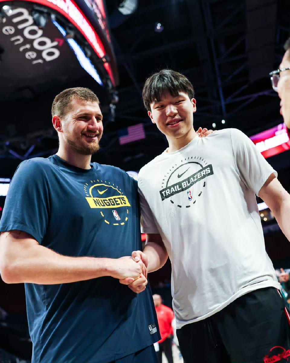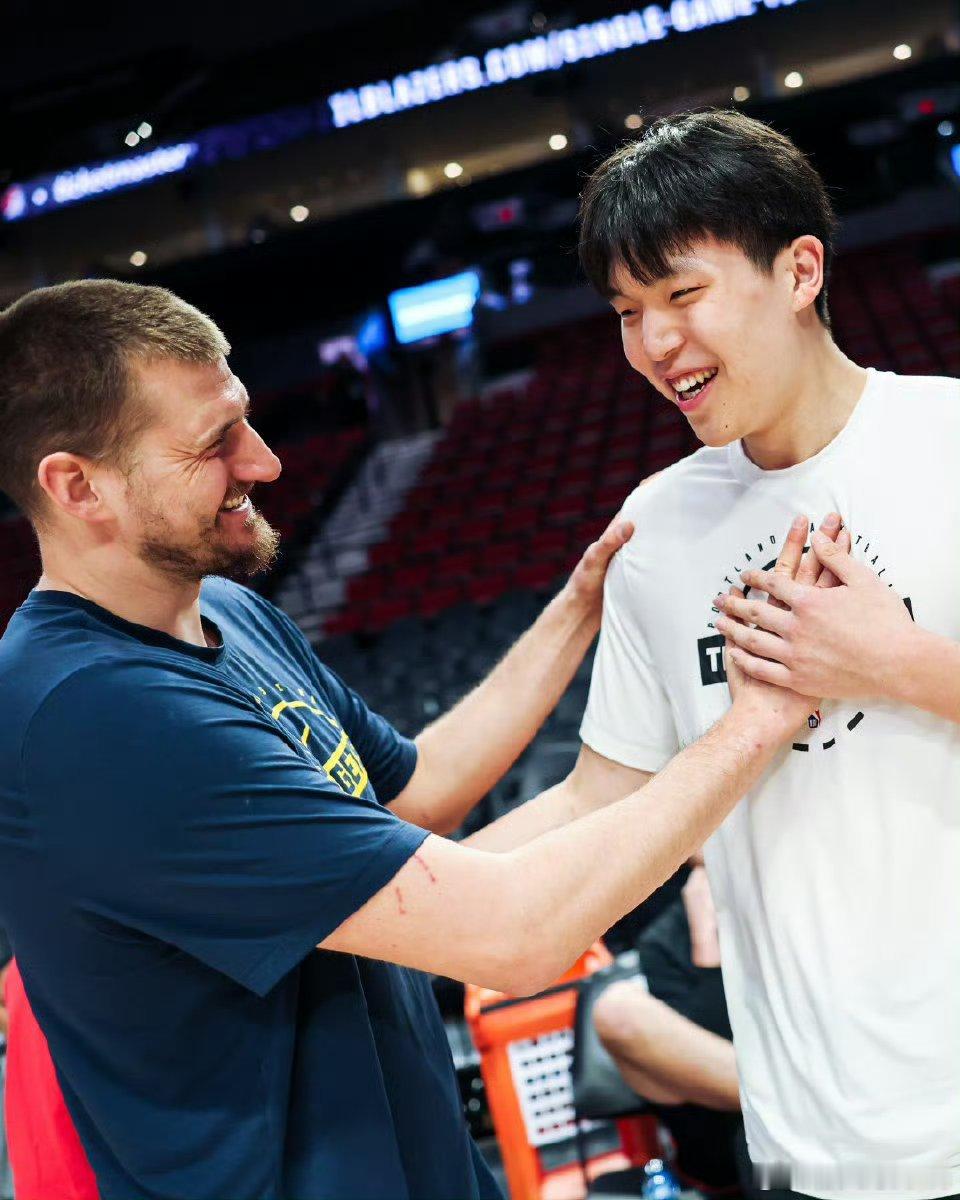 哈哈哈,小杨笑得乐开了花。杨瀚森与约基奇互动掘金vs开拓者波特兰开拓者杨瀚森