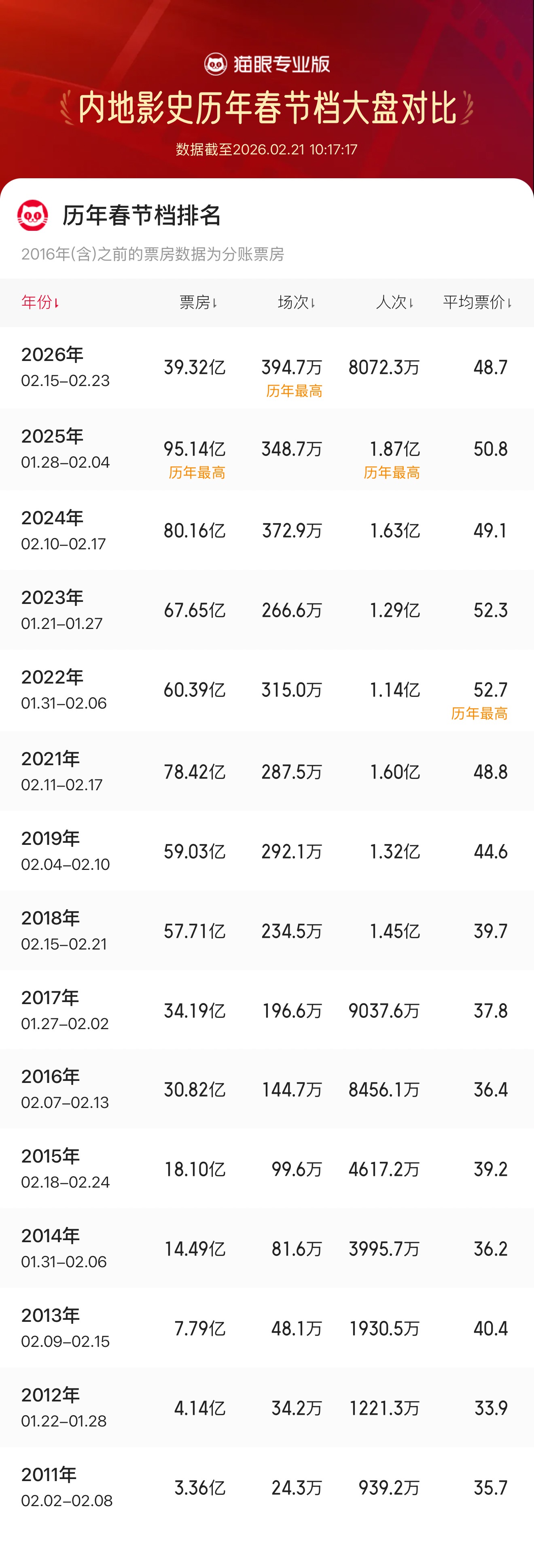 上证报中国证券网讯(记者杨翔菲)据猫眼专业版数据显示,截至2月21日10时17分,2026年春节档总场次已超394.7万,刷新中国影史春节档总场次纪录。截至当前,2026年春节档总票房已达39.32亿元。