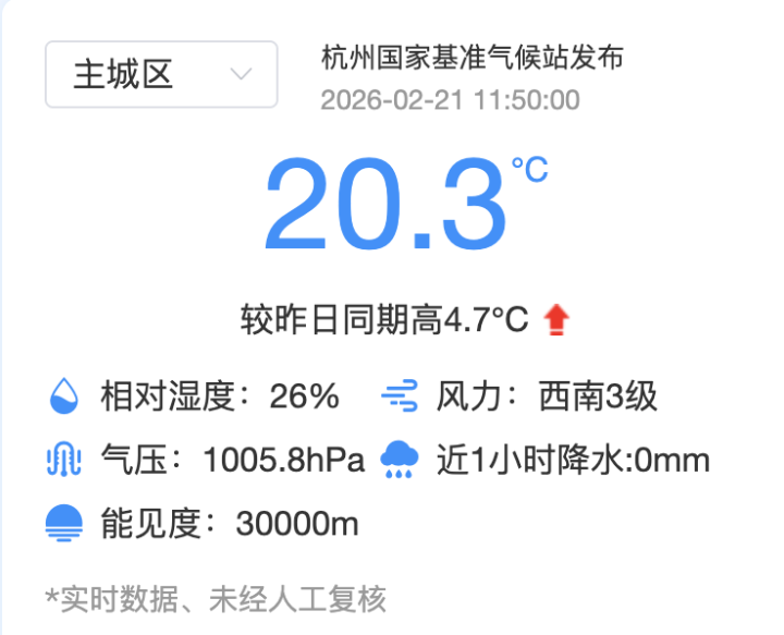 昨天全省大部最高气温17~21℃,共有36个站最高气温突破了20℃,杭州主城区最高气温也冲到了20.1℃。