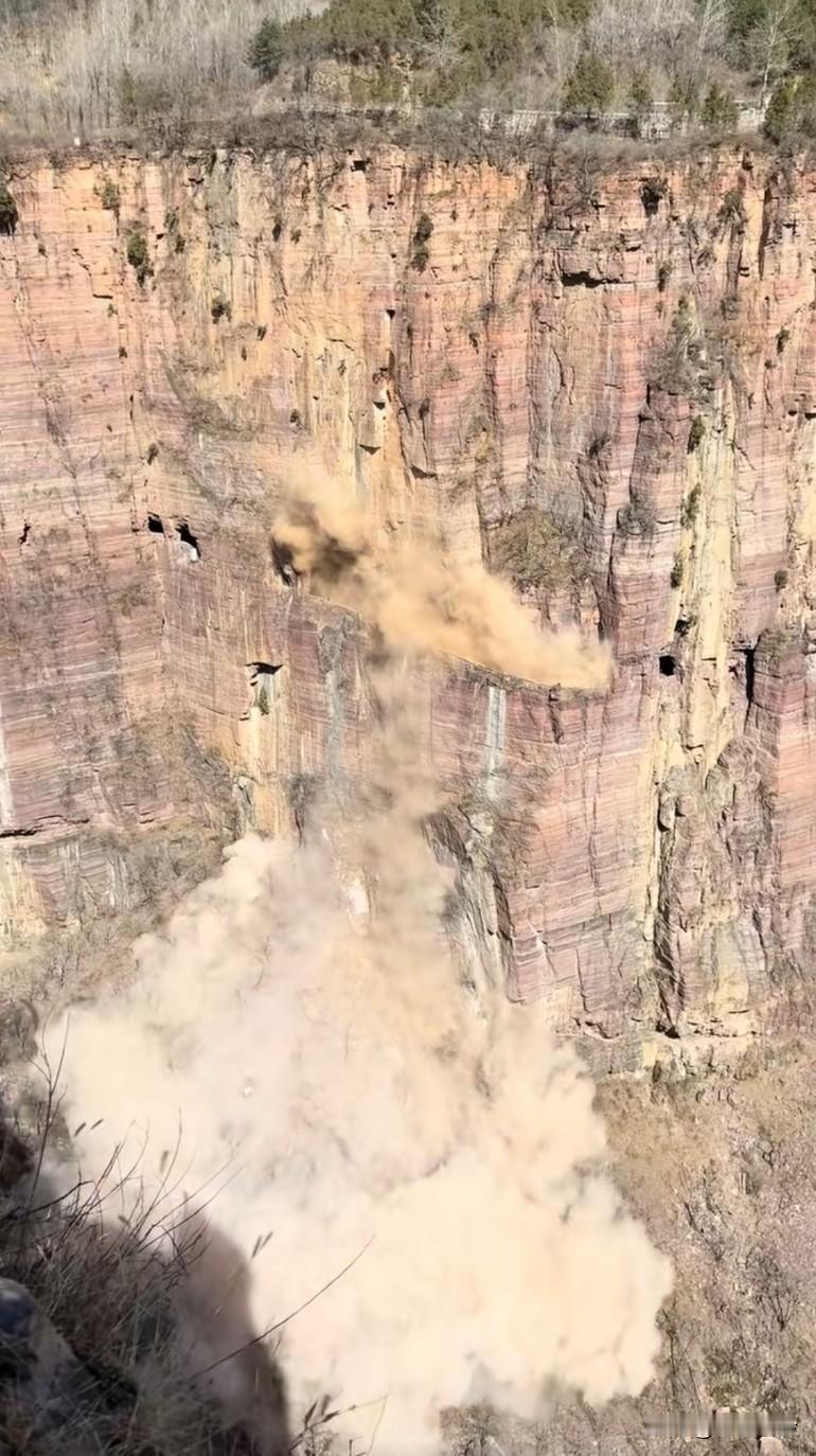 郭亮村挂壁公路发生塌方落石,现场扬起大量灰尘,官方通报系风化冻胀所致 一直想的是夏天雨季不能去山区,怕有落石,没想到这过年期间也有塌方危险了。挂壁公路自然风化,早晚有塌!尤其是雨季岩石有裂隙,发育到一定程度早晚要塌的,没办法预测。