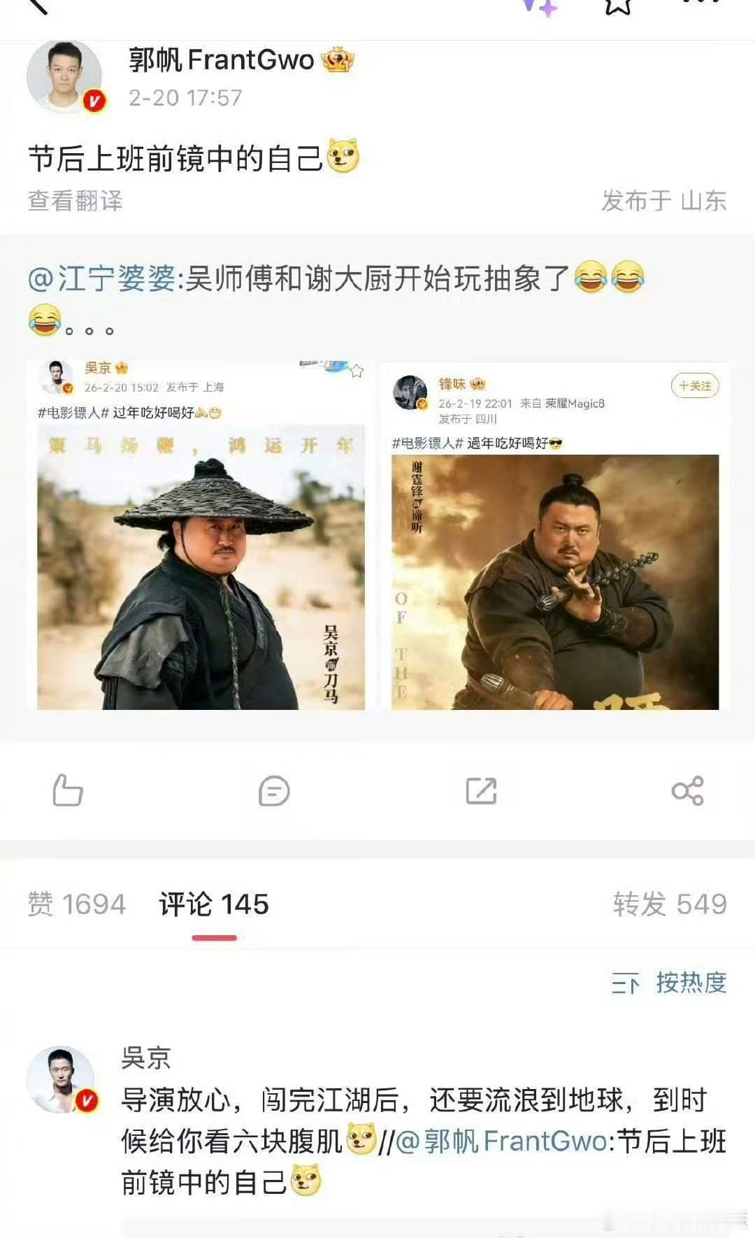 郭帆为镖人狂发16条微博 吴京回应带六块腹肌回流浪地球 郭帆导演为《镖人》连发16条微博,这宣传攻势猛烈。吴京也幽默回应,会带着六块腹肌回《流浪地球》,这波操作让《镖人》的热度持续攀升,电影肯定精彩绝伦!