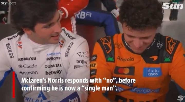 在本周的季前测试中,威廉姆斯车手塞恩斯闲聊时随口问诺里斯:“你和玛格丽达关系还好吗?”,诺里斯回应道“不”,并表示他现在单身。塞恩斯则看起来很惊讶。