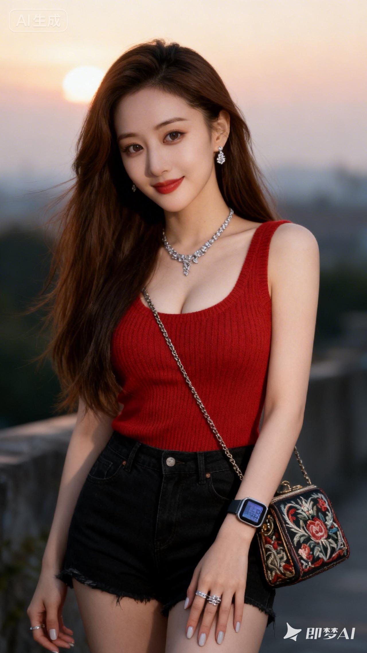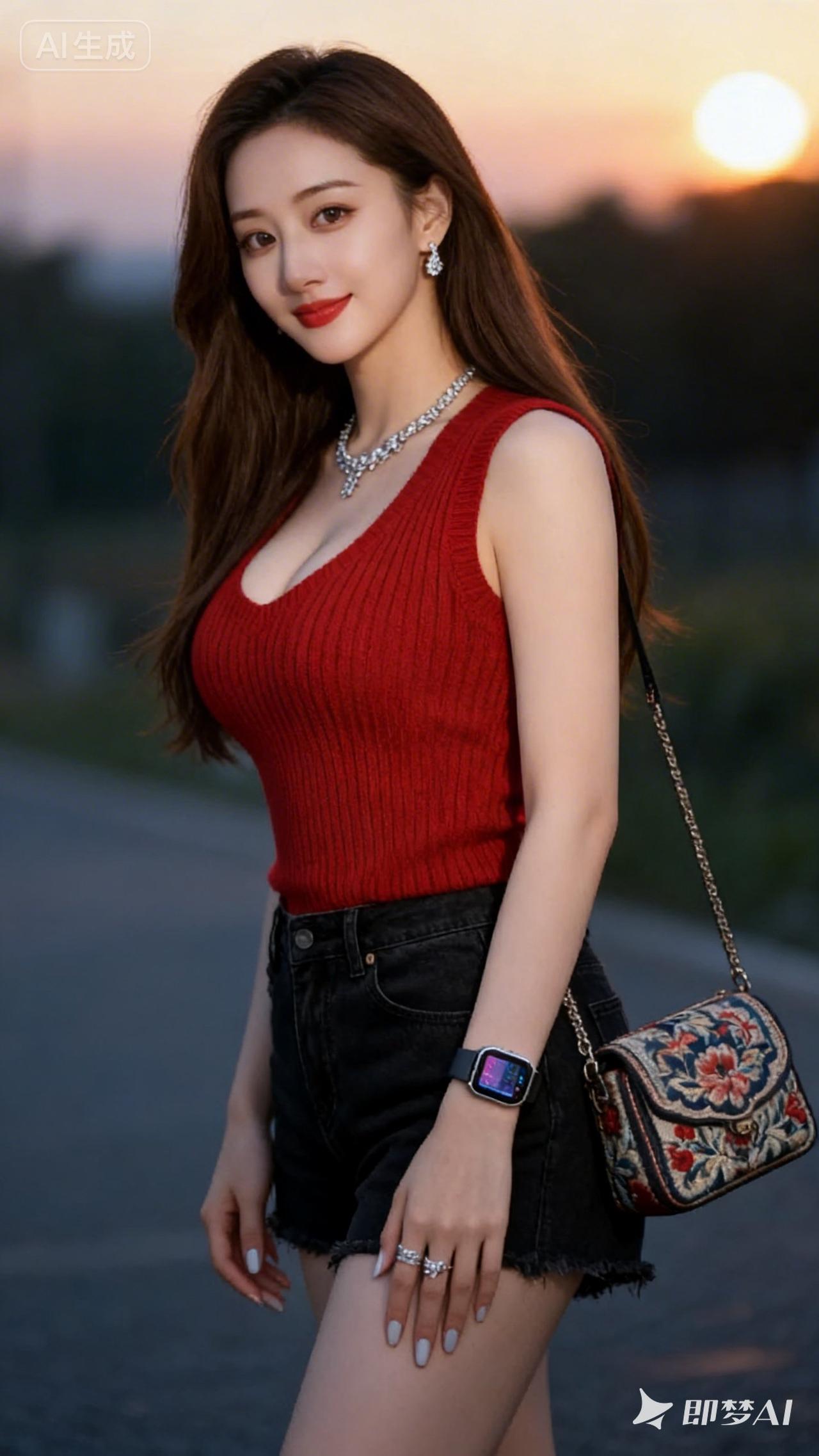 夕阳下的时尚穿搭,红色毛衣搭配黑色短裙,尽显优雅与自信!