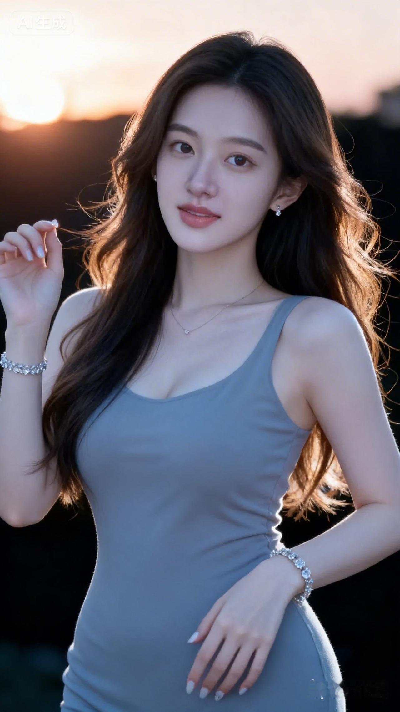 甜美少女风,温柔笑容,时尚穿搭,夜晚的浪漫氛围。