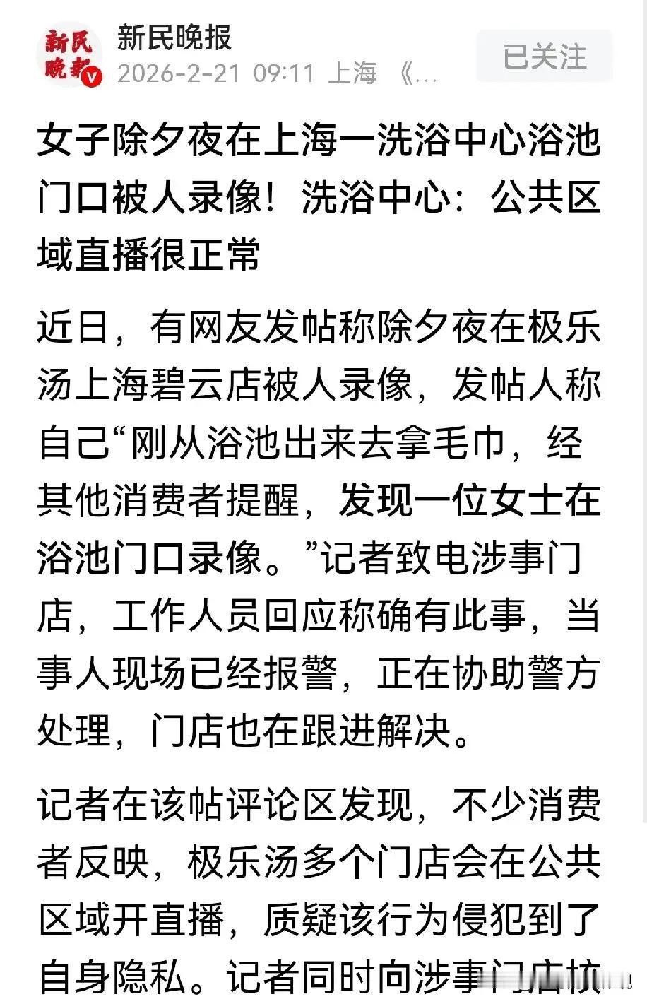 浴池边的警钟:内外双调,守护身心安宁 除夕之夜,本该是万家团圆、其乐融融的时刻。上海某洗浴中心内,灯火通明,热气氤氲。一位女子刚从温暖的浴池中走出,身心正处在最放松、最无防备的状态。就在这毫无遮掩的几秒,旁边一位好心的女子悄声提醒:“快遮一下,那边有人在录像!” 女子心头猛地一紧,顺着方向看去,只见手机镜头正对着出浴的人群。那一刻,她感到一阵脊背发凉,羞辱感与恐惧感交织,让她浑身发抖。这哪里是放松身心的港湾,分明成了隐私被窥视的“狩猎场”! 她没有选择沉默,而是披上衣服,冲过去质问。面对言辞闪烁的拍摄者,她当即报警。这不仅是对自己尊严的捍卫,更是对所有消费者权益的呐喊。真正的健康,绝不仅仅是身体的强健,更是心灵的安宁与安全感。当隐私被肆意践踏,再舒适的温泉也无法抚平内心的惊恐。 然而,更令人愤怒的是店家的回应。工作人员竟表示,公共区域录像、直播“很正常”。这轻描淡写的一句话,彻底点燃了公众的怒火。在他们眼中,顾客的隐私竟不如流量重要?浴池门口,本就是隐私敏感区域,任何未经允许的拍摄,都是对法律与道德底线的公然挑衅。 这件事,给我们敲响了警钟。出门消费,舒服是其次,安全与隐私才是底线。我们感恩那位好心提醒的女子,她的善举,避免了一场可能的隐私灾难。我们也敬佩这位受害女子的勇敢,她的果断,为无数潜在的受害者撑起了保护伞。 朋友们,真正的健康,是内外双调的和谐统一。外在,我们追求身体的强健;内在,我们更需守护心灵的净土。让我们学会用法律武器保护自己,对侵犯隐私的行为说“不”!记住:尊重,才是服务应有的样子;安全,才是消费最基本的保障。愿我们都能在每一个角落,安心沐浴阳光,享受生活!