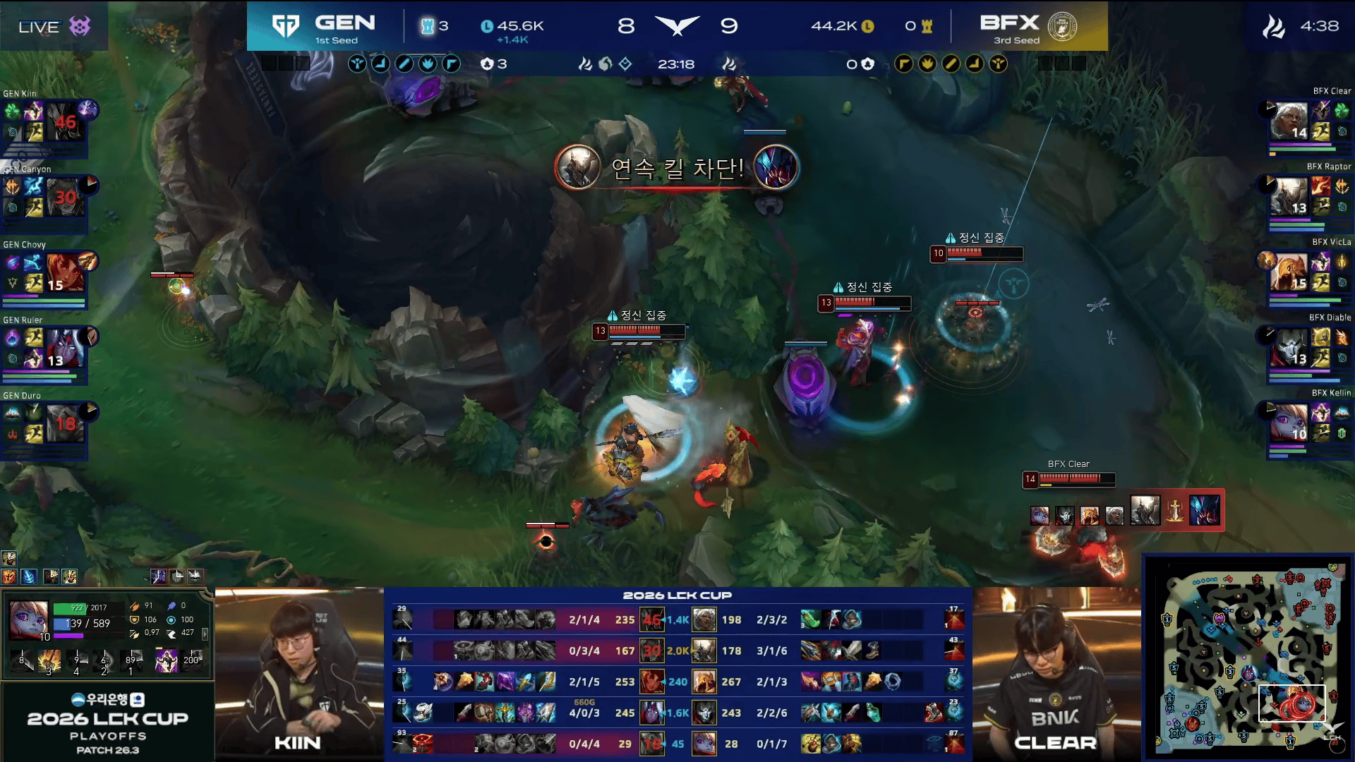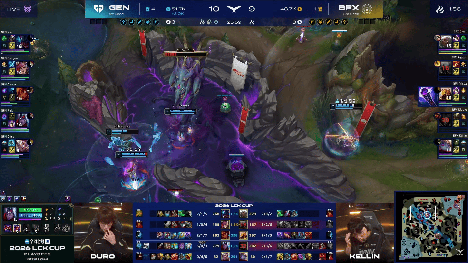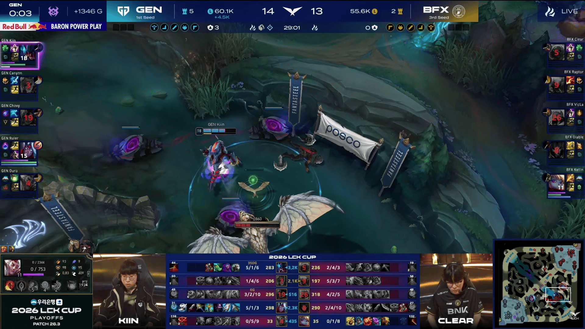 比赛第25分钟,GEN击杀BFX两人后拿下大龙。