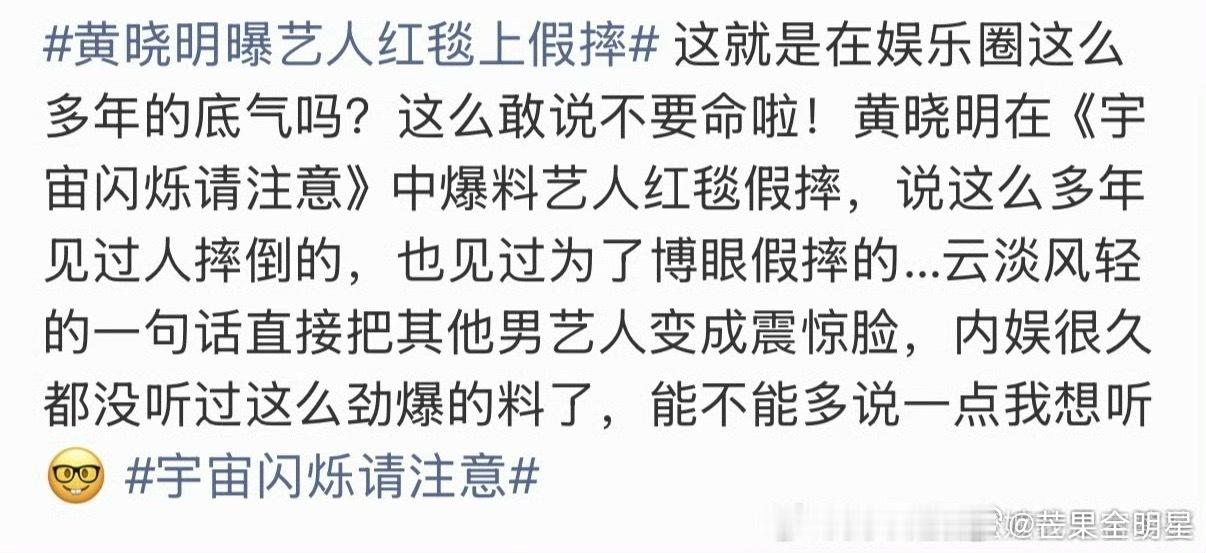 黄晓明曝艺人红毯上假摔赵樱子是真的晕倒了,不是假摔,再讨厌她也没必要硬黑吧,低血糖摔倒过的人应该都知道,摔的前几秒大脑是有意识自己要摔的,只是肢体不受控制