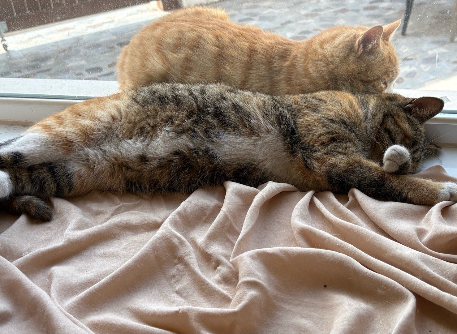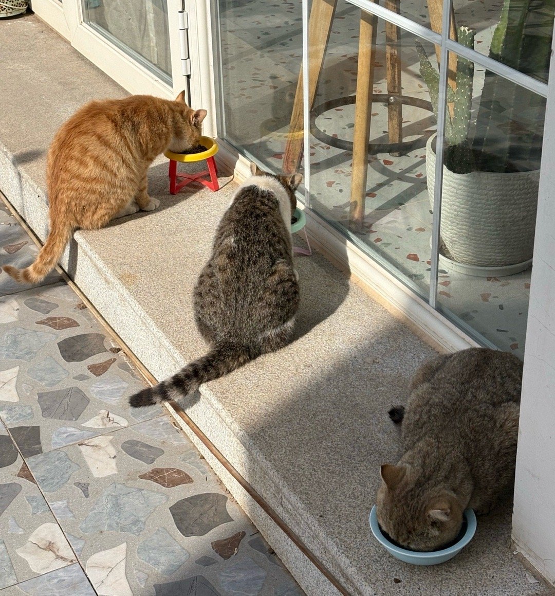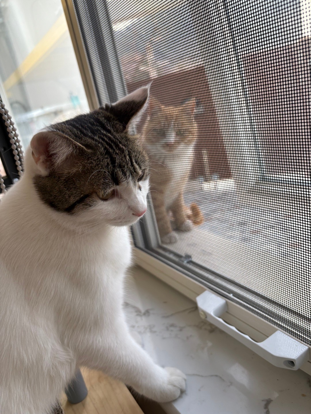 图四窗外站起来的是灰点点,他喜欢进客厅吃饭,但吃完就不爱待了,就要出来。和他对望的是咸蛋。咸蛋和皮蛋因为妈妈被车撞死,我们收养后,是从小奶猫期把他们一把屎一把尿养大的,他们没有在外面闯荡的能力,所以一般不出门,如果出门,我会用牵引带带他们出去。