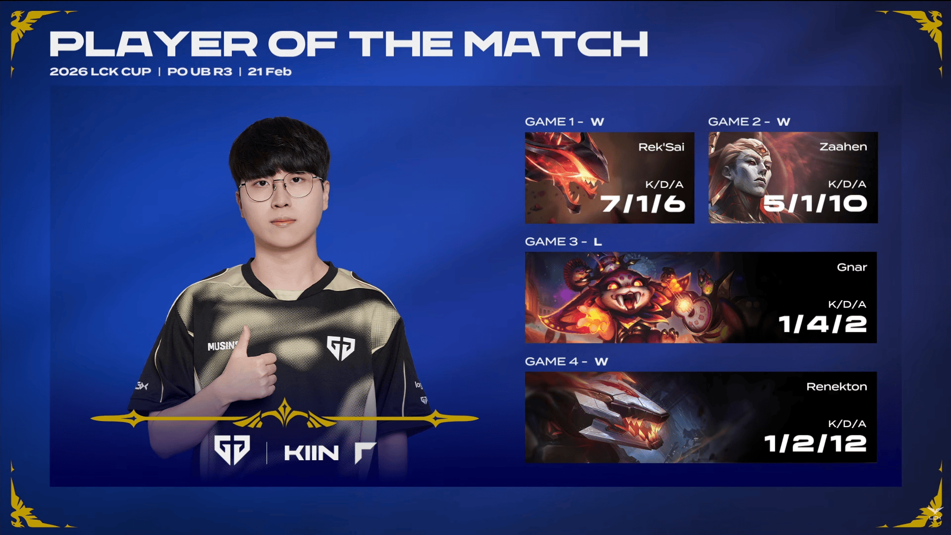 Kiin四局合砍14/8/30的战绩,拿下GEN对阵BFX系列赛MVP