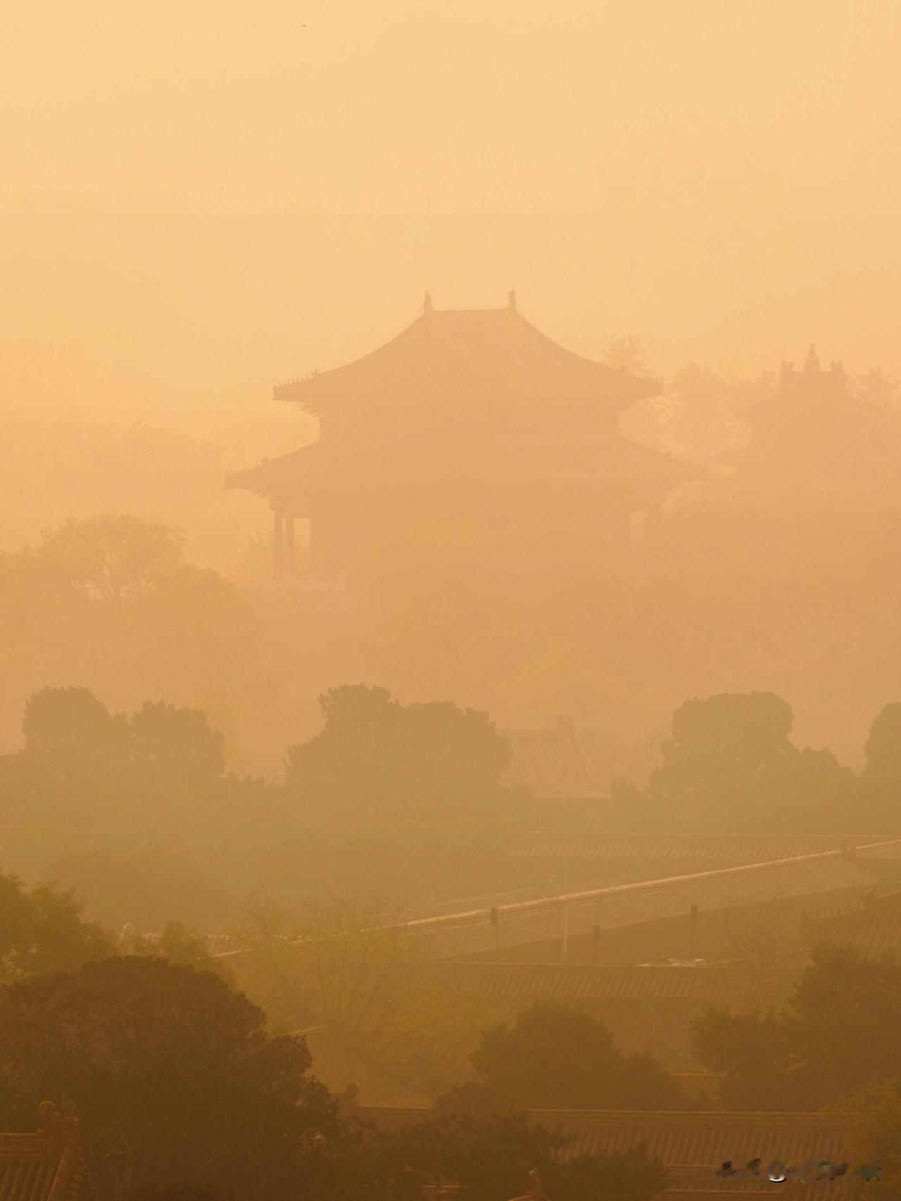 今天北京初春的沙尘暴来了 把故宫刮成了一幅古画 从景山拍过去 朦胧的宫墙檐角 满满的苍茫感 黄沙裹着红墙黄瓦 倒添了别样的古韵 粗犷的风沙 撞上细腻的宫廷建筑,反差感拉满 这样的故宫虽美 还是更爱晴空下的红墙碧瓦 干干净净的模样