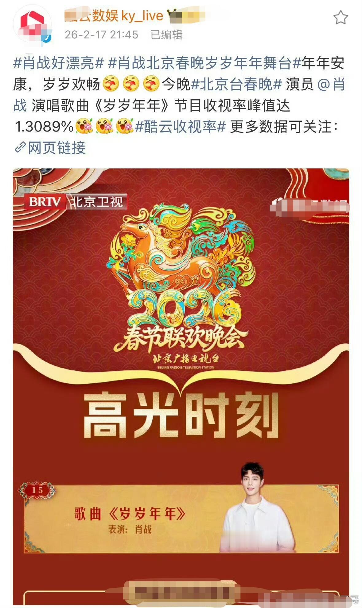 北京台春晚收视率地方台春晚大断层第一!其中肖战表演的舞台《岁岁年年》为北京台春晚高光时刻,收视峰值高达1.3089%,12.4万人同时在线观看 !
