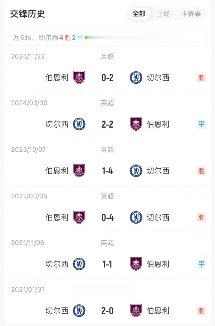 目前,切尔西12胜8平6负积44分位列英超第5;伯恩利4胜6平16负积18分位列倒数第二。切尔西近5轮英超4胜1平保持不败。